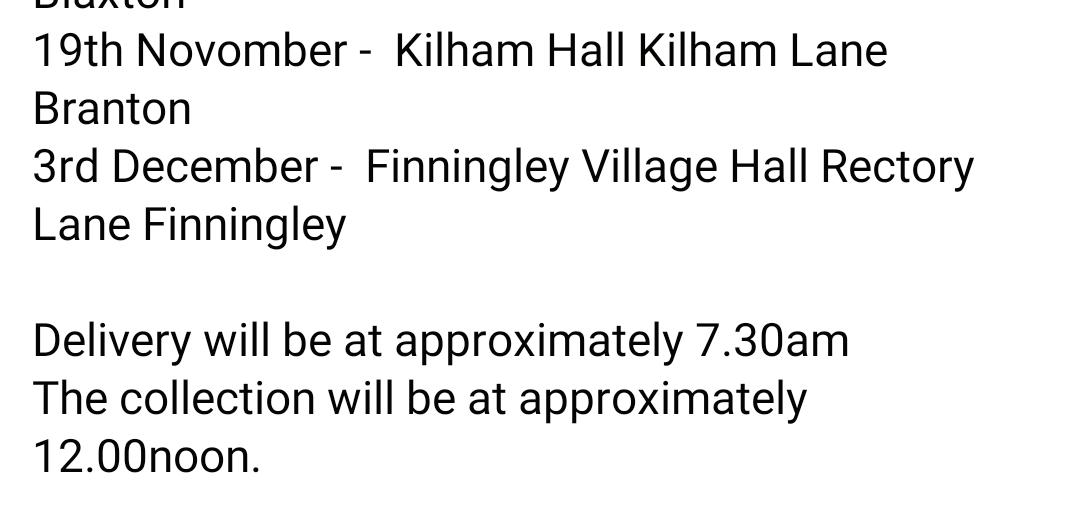 Kilham Hall Branton Community Centre 1.45-2.45pm 07368216114 Linda
