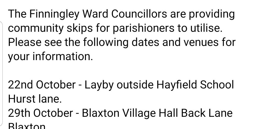 3rd Wednesday in the month Blaxton Parish Council meeting Blaxton Village Hall 7pm