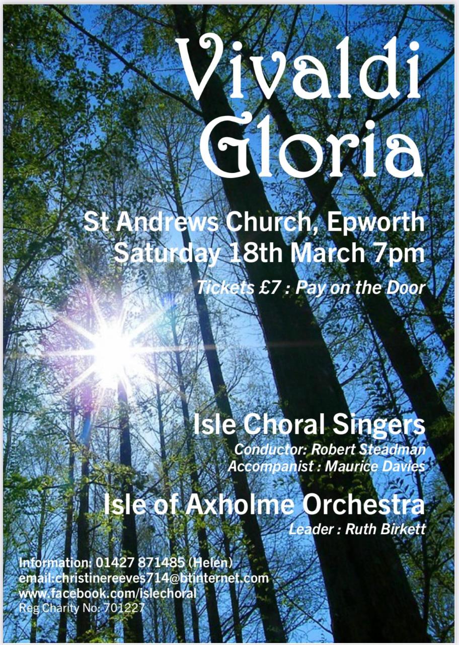 The Isle Choral Singers with the Isle of Axholme Orchestra perform Vivaldi's Gloria and other works on Saturday, March 18th, at St Andrew's Church, Epworth. Tickets £7 on the door.