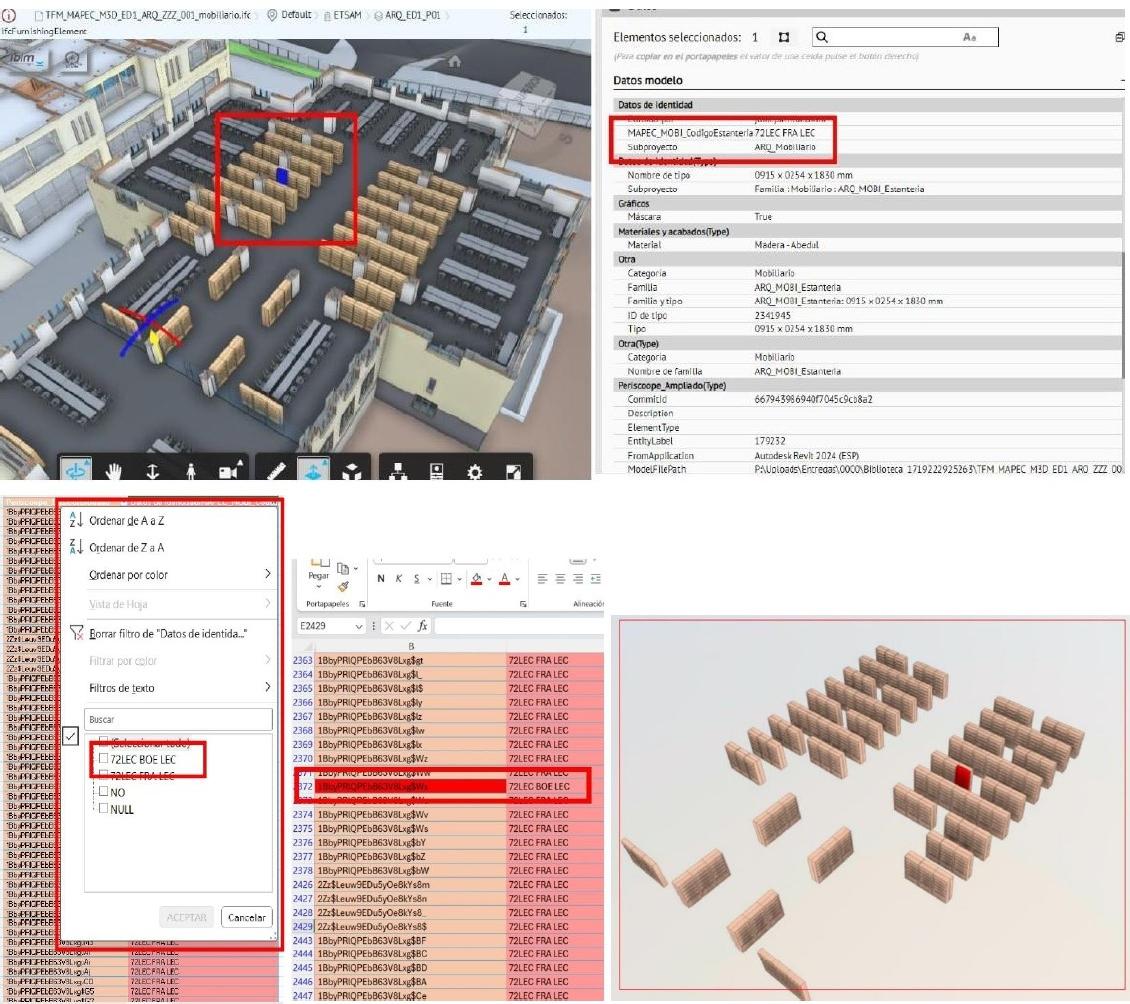 El modelo puede servir como ayuda para los estudiantes a la hora de buscar un documento en la biblioteca Se ha utilizado una exportación del modelo de las Condiciones Existentes de la ETSAM en formato IFC, de donde se obtiene todos los datos de los elementos del modelo en un visualizador web sin la necesidad de instalar ningún programa adicional.