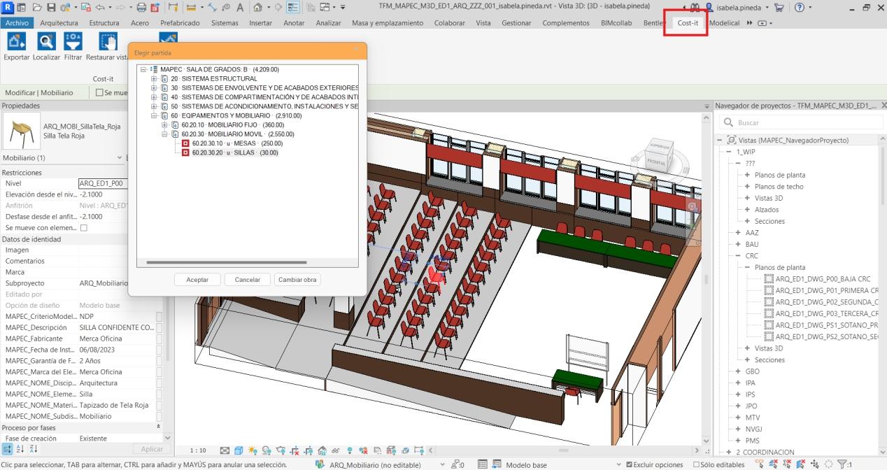 El objetivo de este Uso BIM, es proporcionar la información necesaria a través del modelo BIM para la creación de mediciones, ya que estas constituyen una fase primordial en el ciclo de vida del edificio Para un buen desarrollo de este uso, se designó el software P r e s t o u n i d o c o n GUBIMCLASS para la creación de las mediciones e información de códigos y nomenclaturas, destacando su uso en un sector específico de la construcción. El aula designada para su presupuesto, será la “Sala de grados B” de la Etsam, por ser un espacio representativo. Para desglosar cada elemento constructivo, desde los materiales de construcción, hasta el mobiliario y equipos de instalaciones se utilizó el software Presto, el cual mediante Cost-It permitió la exportación de archivos desde Revit.