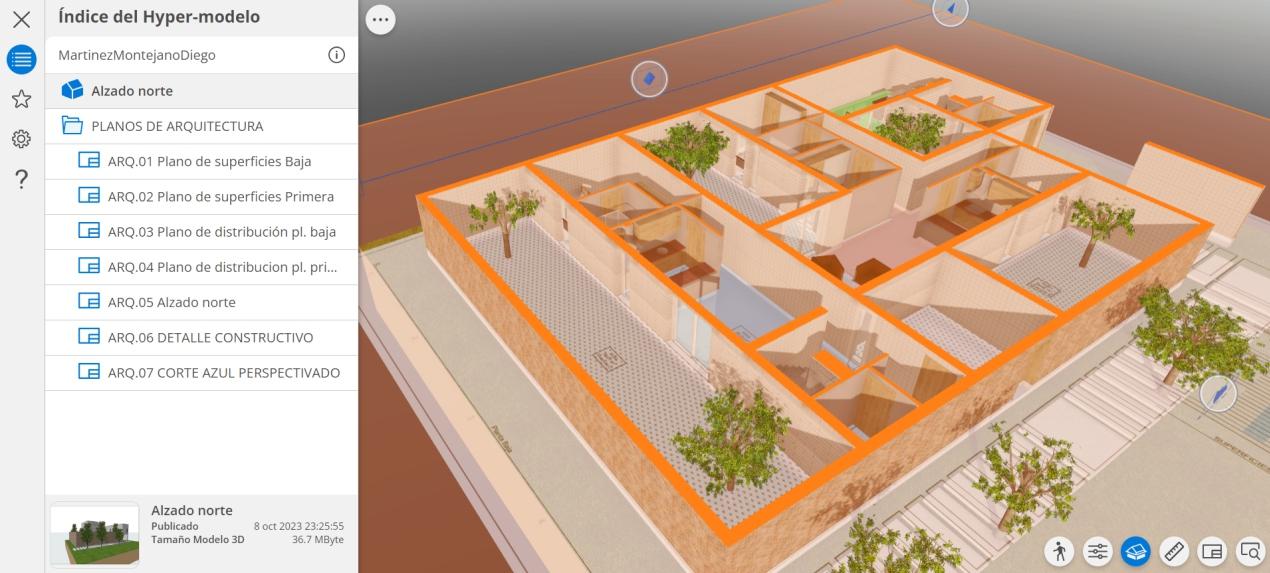El siguiente software implementado en esta maestría fue Archicad, resaltando sus fases de documentación, de las cuales, la ultima se trato de publicar el archivo en la plataforma de BIMx, donde se nos permitía abrir y explorar interactivamente el modelo en 3D, que gráficamente esta anexado a la planimetría elaborada en Archicad. En este motor 3D se puede navegar por la jerarquía del indice de las carpetas o modelos 3D, mostrando la pre visualización e información básica.