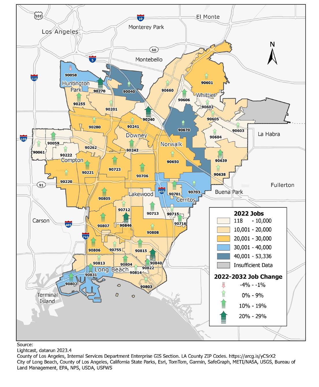 The greatest concentration of jobs are shown in ZIP codes in the City of Commerce, Santa Fe Springs, and parts of Long Beach. ZIP codes with the lowest number of jobs include areas in Compton, Lakewood, Maywood, and parts of Whittier. Nearly every ZIP code in the subregion is projected to undergo job growth in the next 10 years, except one ZIP code in Southeast Los Angeles. (See Appendix A for more details.)
