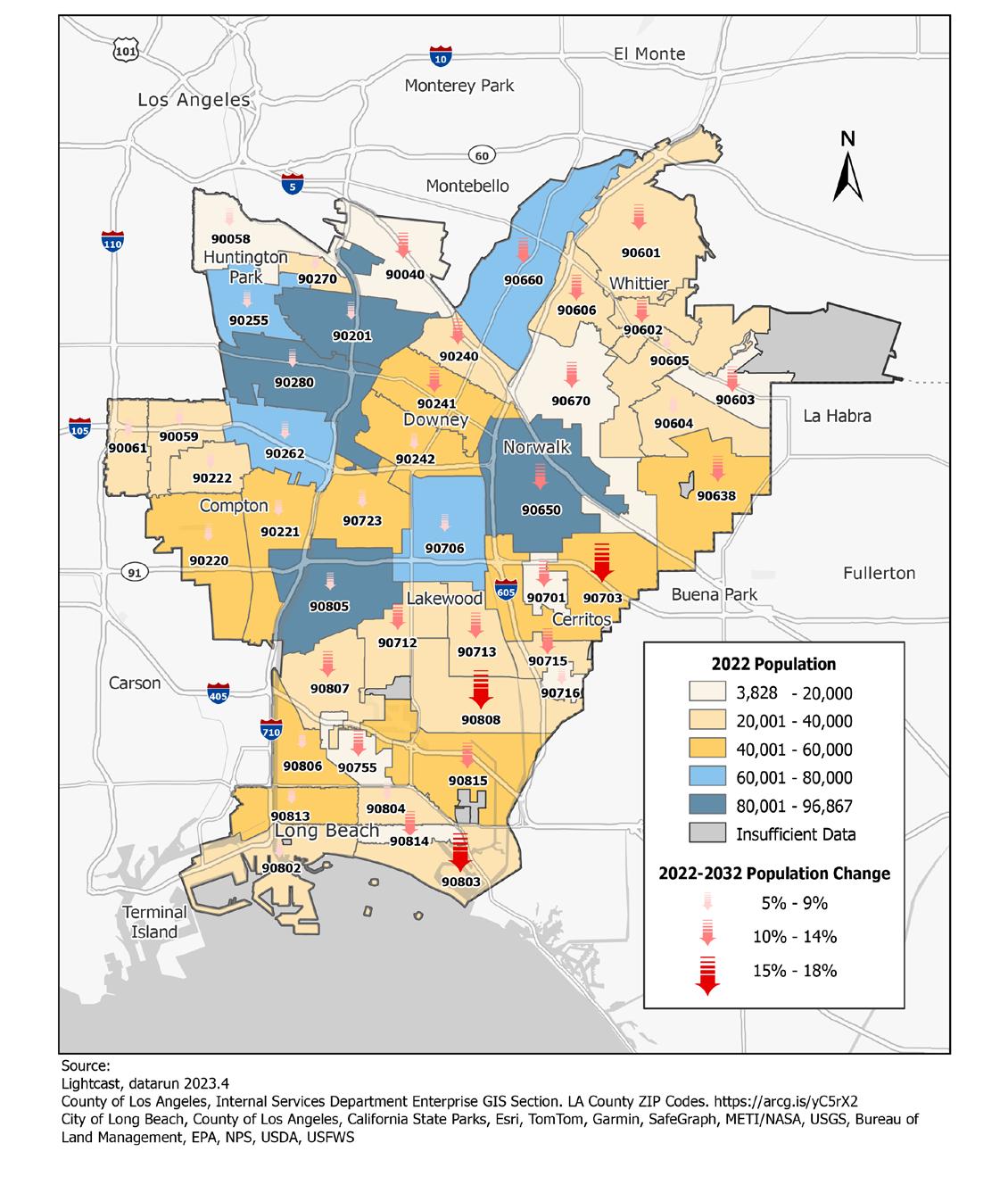 An analysis of ZIP codes shows areas near Bell Gardens, North Long Beach, Norwalk, and South Gate have the highest concentration of residents in the subregion. The lowest concentration of residents occurs in areas including Artesia, Santa Fe Springs, Signal Hill, and Vernon. All ZIP codes in the subregion are projected to undergo a declining population over the next 10 years. (See Appendix A for more details.)