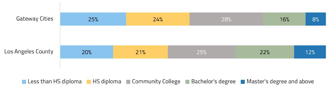In the subregion, 24% of the population over the age of 25 has completed a bachelor’s degree or higher, 28% has completed community college, 24% has completed high school, and 25% has less than a high school diploma (Exhibit 5). Areas with high educational attainment mirror ZIP codes with high income in the east side of the subregion. Areas displaying a higher concentration of residents who have completed a bachelor’s degree or higher include Cerritos and parts of Long Beach. ZIP codes with a lower concentration of residents who have completed a bachelor’s degree or higher include areas in Compton, Huntington Park, Lynwood, Maywood, Pico Rivera, and South Gate. (See Appendix A for more details.)