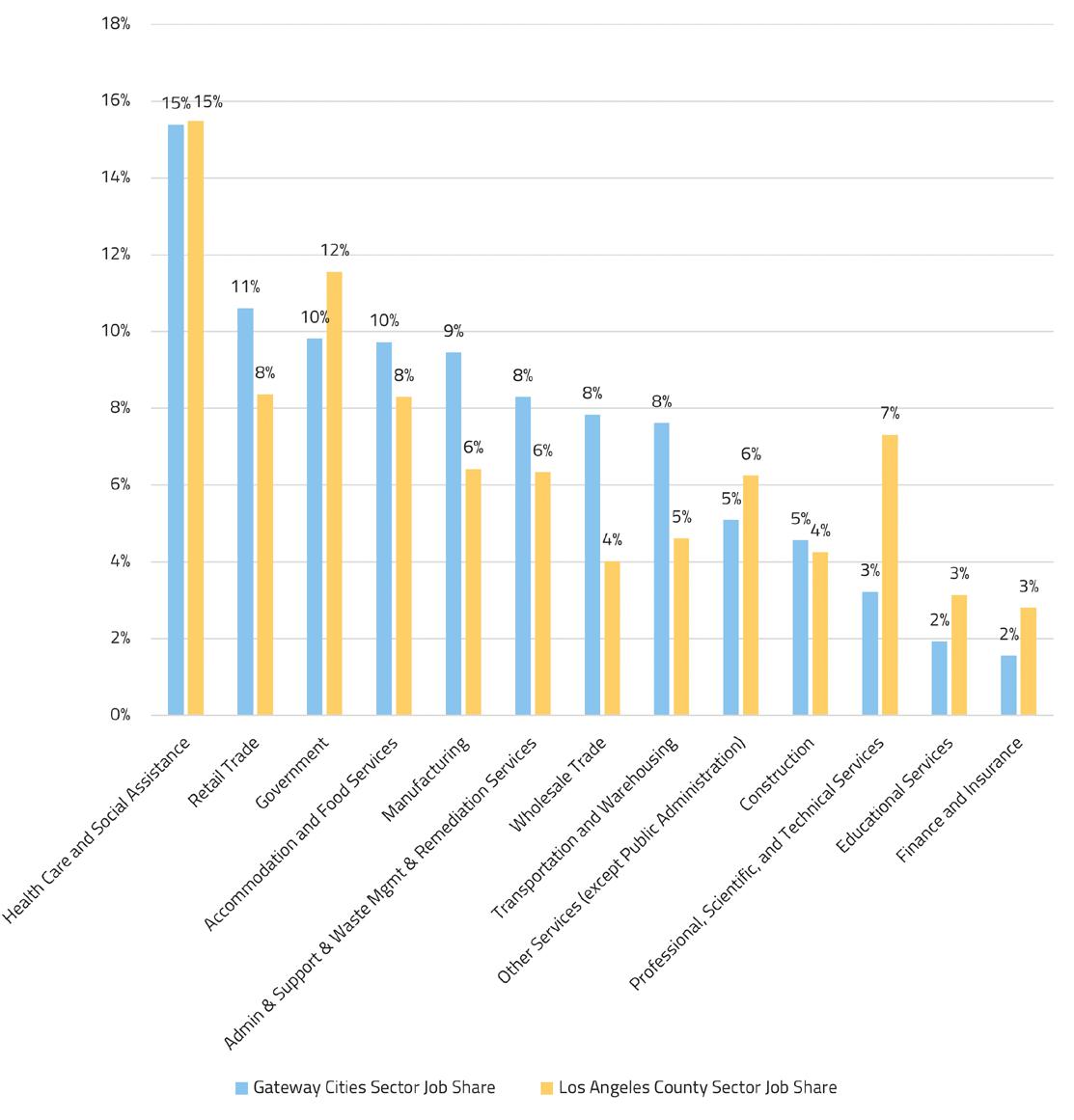 The composition of industry employment in the subregion differs from Los Angeles County in several ways. The subregion has a larger share of jobs than Los Angeles County in the following industry sectors (Exhibit 10):