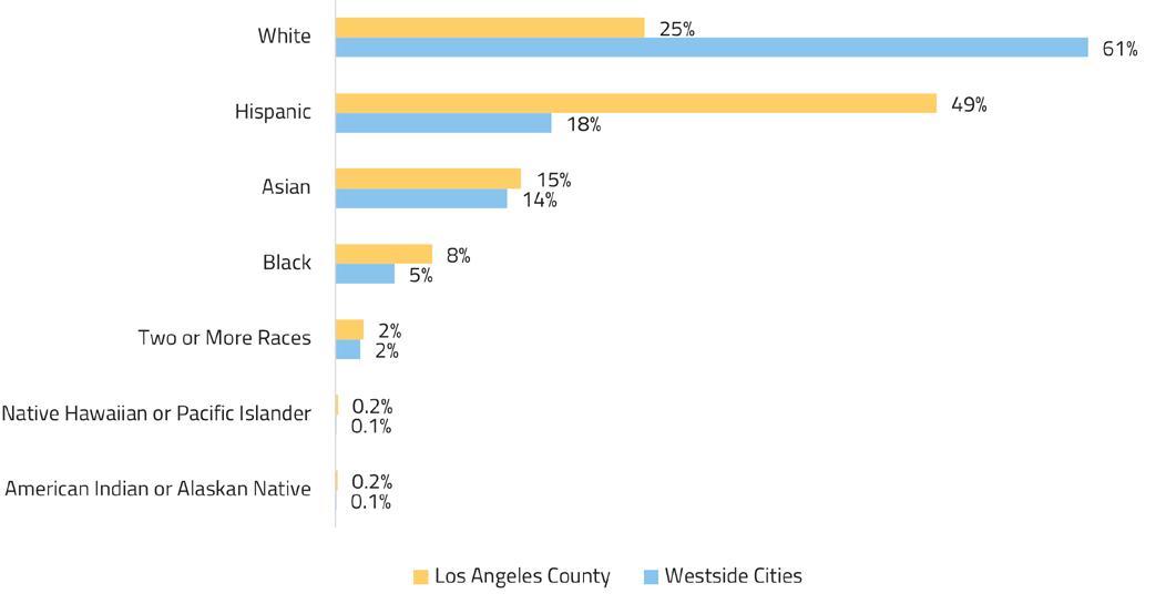 In 2022, 61% of the subregion’s population identified as white, followed by 18% Hispanic, 14% Asian, and 5% Black (Exhibit 6). Compared to the county overall, the subregion has a higher percentage of white residents and a lower percentage of Asian, Black, and Hispanic residents.