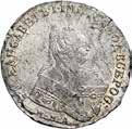 Rublo 1767, San Pietroburgo AR. 24,30g. ø30,8mm. Б•М•ЕКАТЕРИНА•ІІ•ІМП•ІСАМОД• ВСЕРОС Busto a d., nel troncato Т•І•, sotto СПБ. Rv: 17 67 in alto, МОНЕТА• РУБЛЬ Aquila imperiale; ai lati АШ. T[ Godronato. ↑. Davenport 1684. Bitkin 201. Severin 1993.
