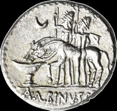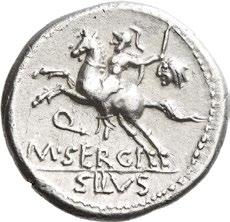 M. Sergius Silus. Denarius 116 or 115, AR 19 mm, 3.78 g. Helmeted head of Roma r.; behind, ROMA and before, EX·S·C. Rev. Horseman l., holding sword and a severed head in l. hand; below horse, Q / M·SERGI and in exergue, SILVS. Babelon Sergia 1. Sydenham 544. RBW 1115. Crawford 286/1.