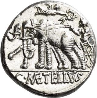 C. Caecilius Metellus Caprarius. Denarius 125, AR 17 mm, 3.94 g. Head of Roma r., wearing Phrygian helmet; below chin, and behind, ROMA. Rev. Jupiter, crowned by Victory, in biga of elephants l., holding thunderbolt in l. hand and reins in r.; in exergue, C·METELLVS. Babelon Caecilia 14. Sydenham 485. RBW 1085. Crawford 269/1.