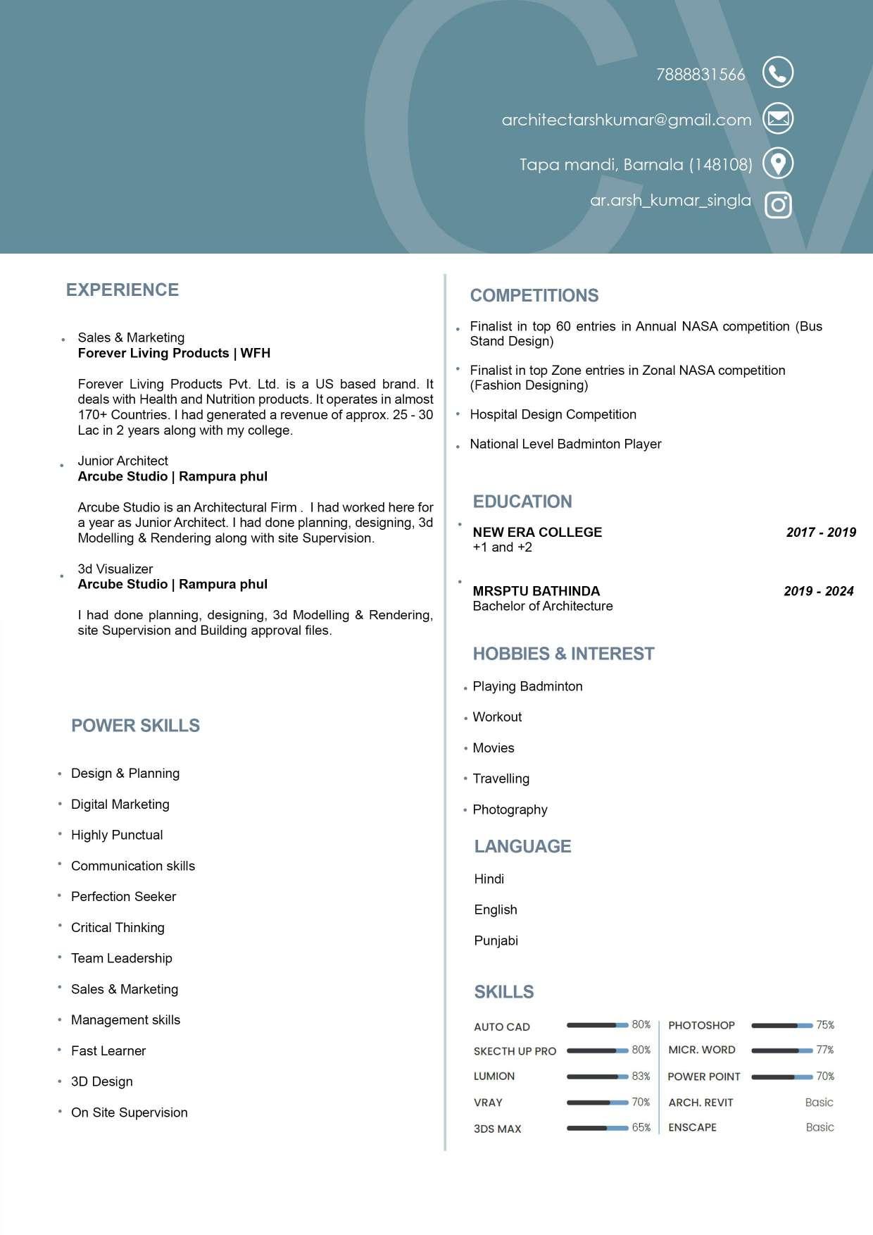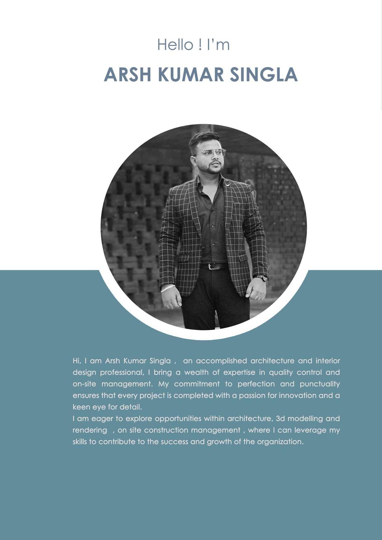 Hi, I am Arsh Kumar Singla, an accomplished architecture and interior design professional. I bring a wealth of expertise in quality control and on - site management. My commitment to perfection and punctuality ensures that every project is completed with a passion for innovation and a keen eye for details.