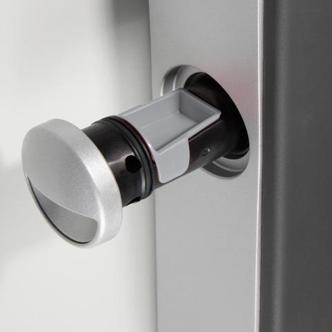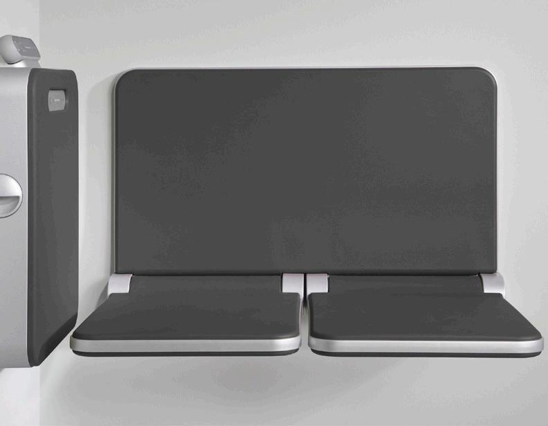 Sitz mit hochwertiger, reinigungsfreundlicher Oberfläche, in der Farbe Anthrazit (RAL 7021) lieferbar. Klappbar, ein Magnet sorgt für sicheren Halt im hochgeklappten Zustand. Integrierte Bewegungsdämpfer für sanftes Herunterklappen. Für Personen mit Herzschrittmacher nur bedingt geeignet.