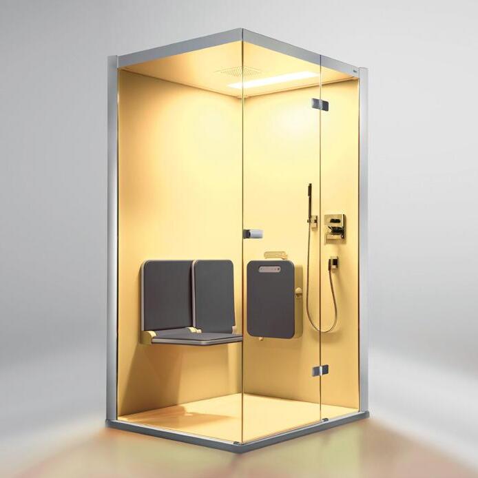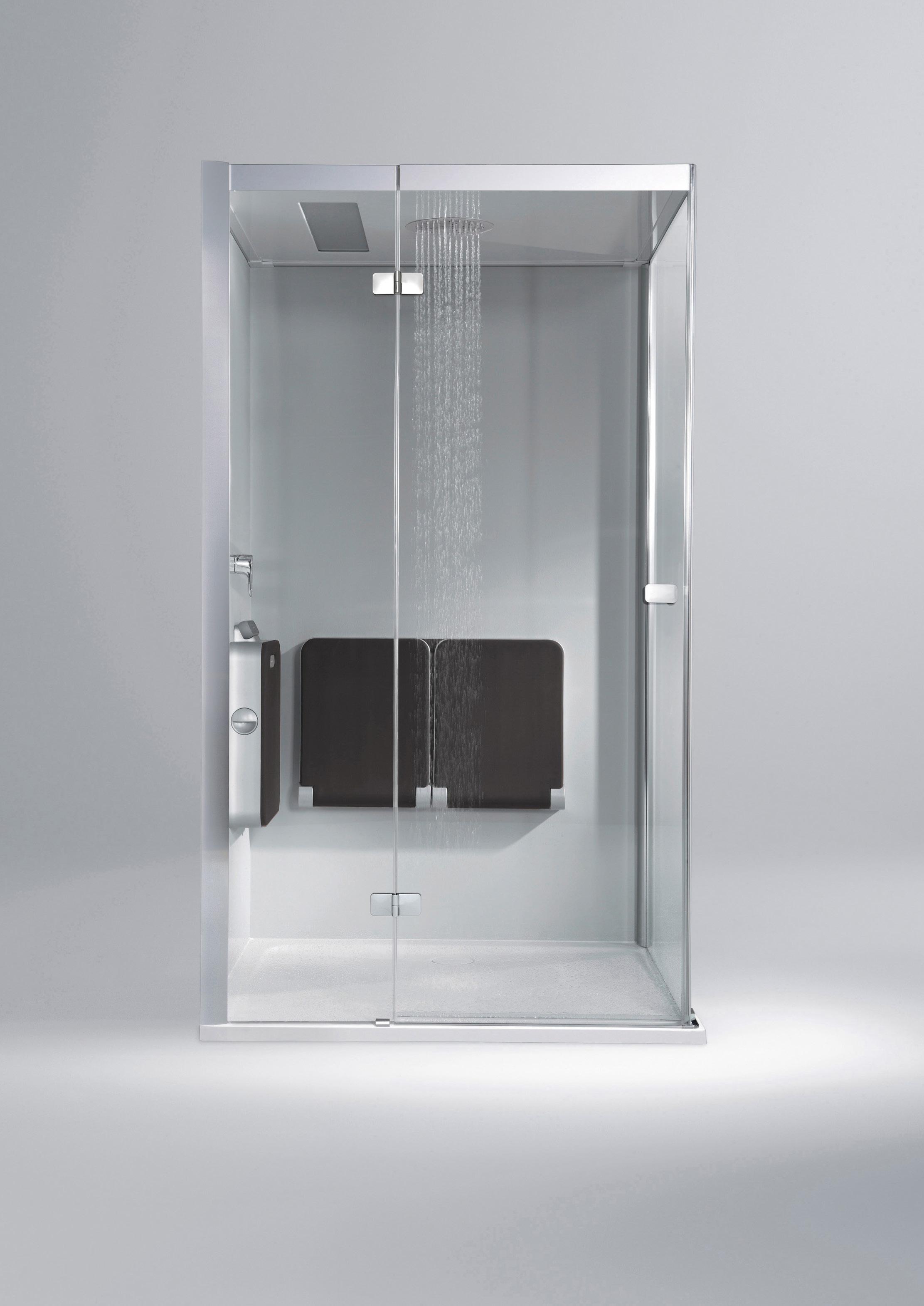 Wer seine private Wohlfühl-Oase haben möchte, sollte nicht gleich an der ersten Hürde scheiterneinem zu kleinen Bad! Weil in die BODY+SOUL die Dusche integriert ist, spart sie Platz und schafft auch bei engeren Platzverhältnissen viel Raum. Das Konzept mit vielen durchdachten Details macht’s möglich - die extraschmale Dampfbox lässt auch in kleinen Bädern genügend Platz für ein wohltuendes Dampfbad. Und zum Duschen klappen Sie den Sitz einfach hoch.