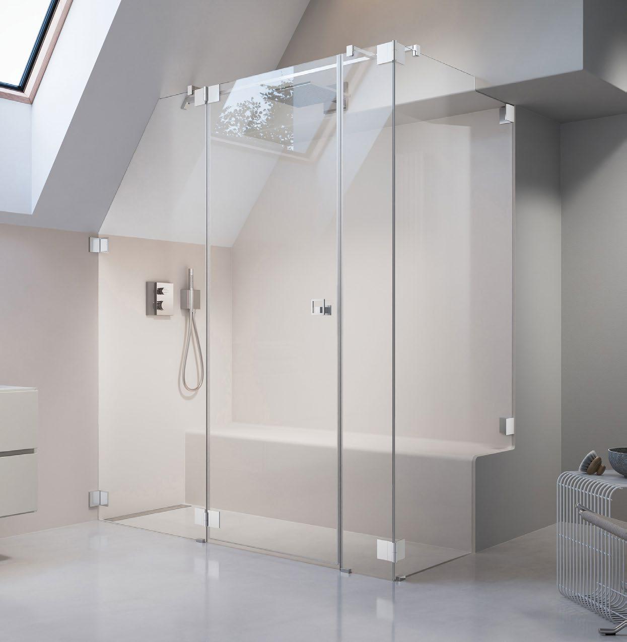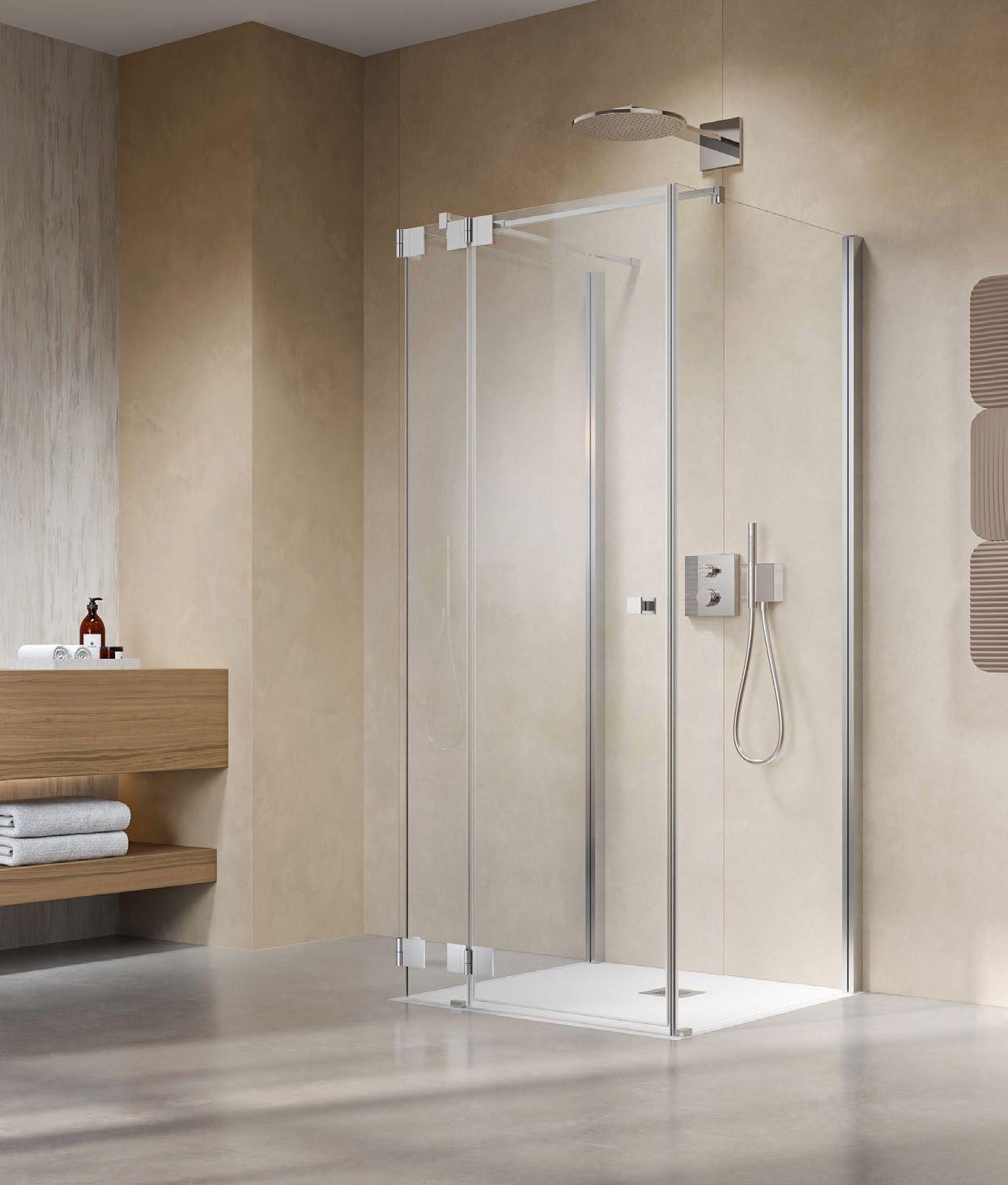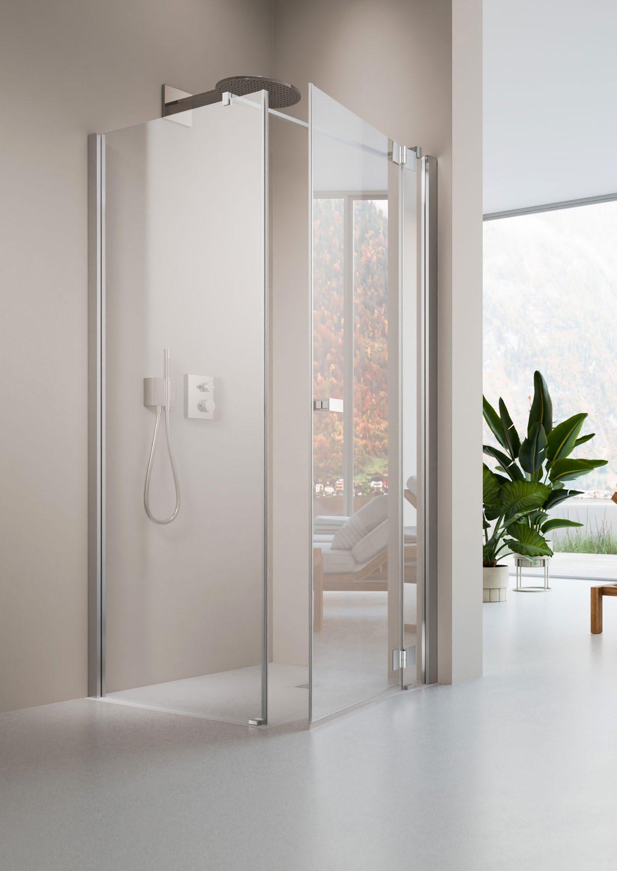Moderne, offene Duschlösungen ohne Türen sind nun auch in kleineren Bädern möglich. Die 360 ° TWIN-Scharniere sorgen für elegante, stabile Funktionalität, die ARTCLEAR Glasveredelung reduziert den Reinigungsaufwand auf ein Minimum.