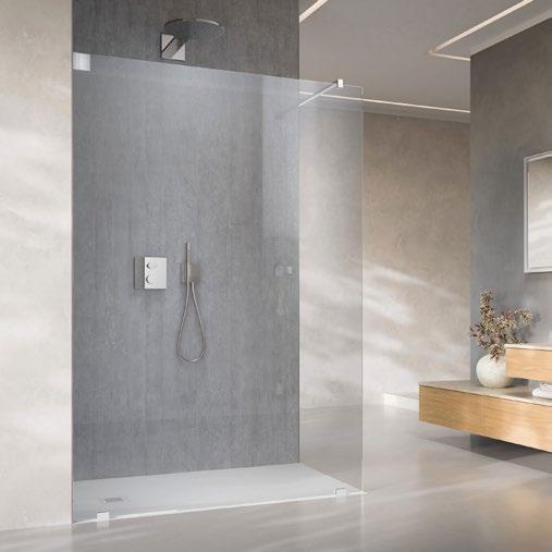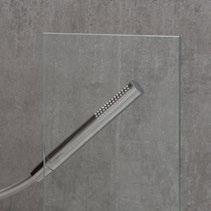 Offene Duschlösung mit voller Transparenz. Wahlweise mit durchgehendem Wandprofil oder geklebten Wandwinkeln. Optional mit Anhaltestange oder Spritzschutz-Flügel.