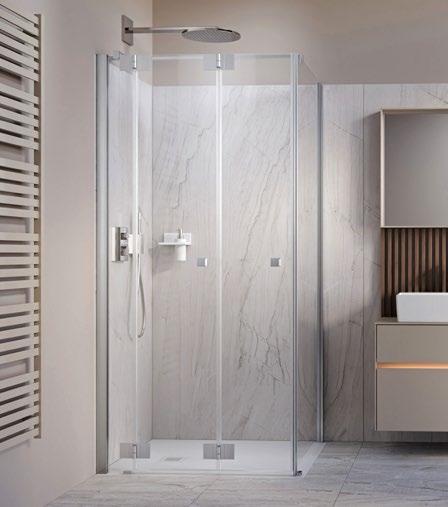 Die clevere Falttür-Variante für Bäder mit wenig Platz. Zum Duschen entfaltet sich eine großzügige Walk In-Lösung. Nach Gebrauch legt sich die Duschwand wieder platzsparend an die Wand.