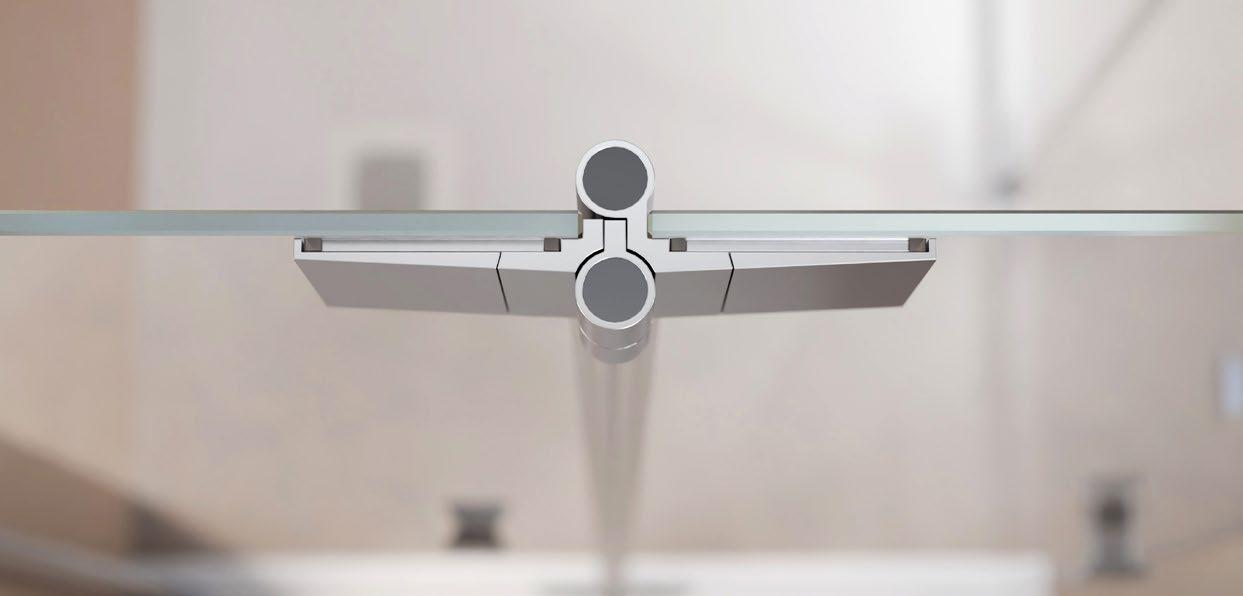 Die Montage kann wahlweise nach innen oder außen erfolgen und erlaubt einen vertikalen Winkelausgleich der Gläser bis ±3°.