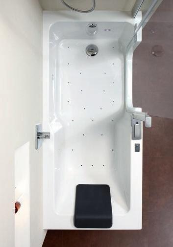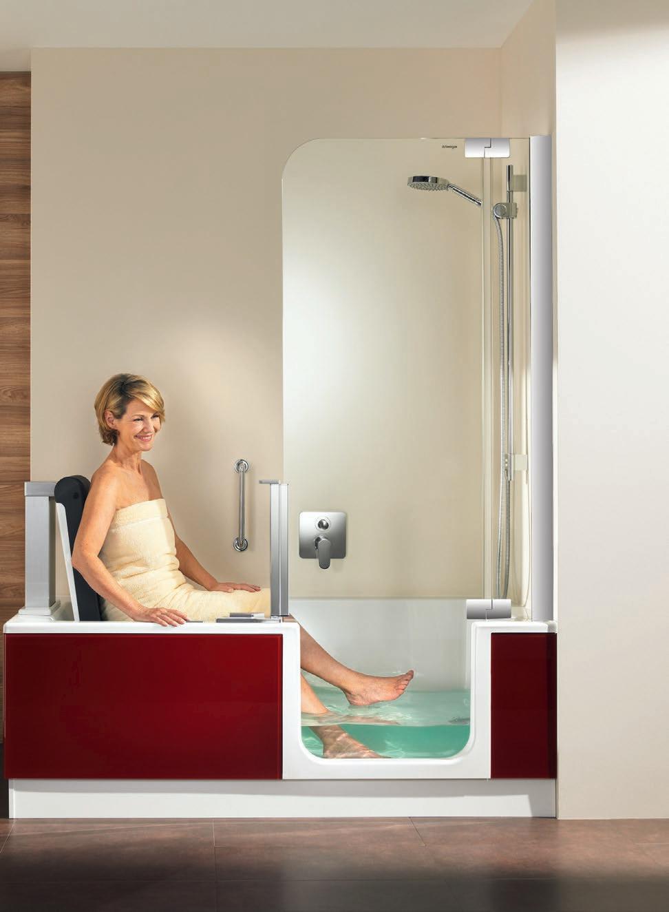 sorgt für Spritzschutz und zuverlässige Dichtheit. Zusätzlich bietet die TWINLINE 1 jede Menge Komfort. Dank der integrierten Nackenstütze können Sie sich beim Baden völlig entspannt zurücklehnen. Ein in den Wannenrand integrierter Sitz ermöglicht Körperpflege der bequemeren Art.