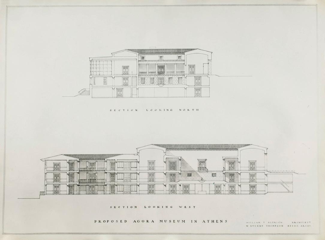 Top middle Figure 4: Proposed Agora Museum in Athens, sections looking North and West, by W. Stuart Thompson and Phelps Barnum, Architects, and William T. Aldrich Consulting Architect, July, 1947, Homer Thompson Archive. (Photo/John Blazejewski)
