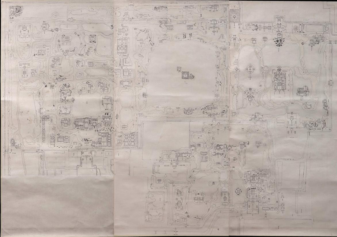 Bottom left Figure 5: Unknown artist. Hand-drawn Map of the Yuanmingyuan Imperial GardenPalace, 1920. Three hanging scrolls; ink and color on paper; Princeton University Art Museum, Gift of the P. Y. and Kinmay W. Tang Center for East Asian Art