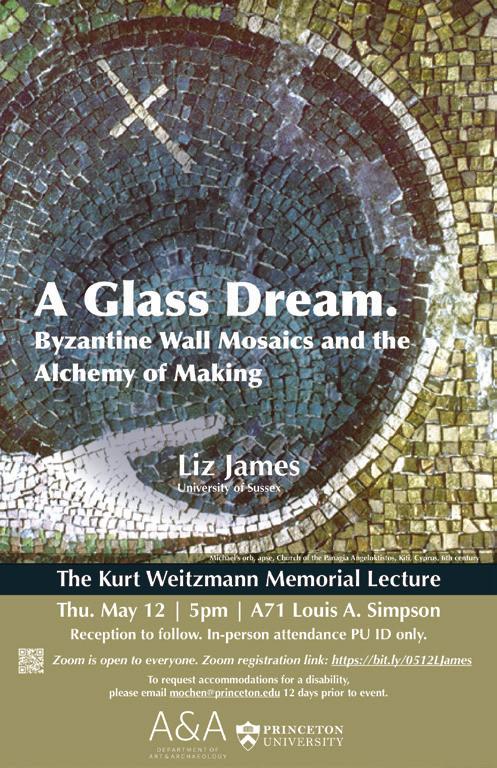 In 2021–22, Beatrice Kitzinger served as Acting Director of the Program in Medieval Studies; the senior thesis colloquium included students working in classics, English, and history, along with art & archaeology. In January, she co-organized the conference “Power, Patronage, and Production: Book Arts from Central Europe in American Collections” (bookarts. princeton.edu) with Professor Jeffrey Hamburger (Harvard University) and Joshua O’Driscoll (Pierpont Morgan Library and Museum) in partnership with the Index of Medieval Art and the Morgan Library. The conference complemented the Morgan’s special exhibition, “Imperial Splendor” (themorgan.org/exhibitions/ imperial-splendor). Kitzinger’s article, “Wandalgarius’ Letters of the Law: Figural Initials and Book Culture in the Late Eighth Century” appeared in the Zeitschrift für Kunstgeschichte in the fall.