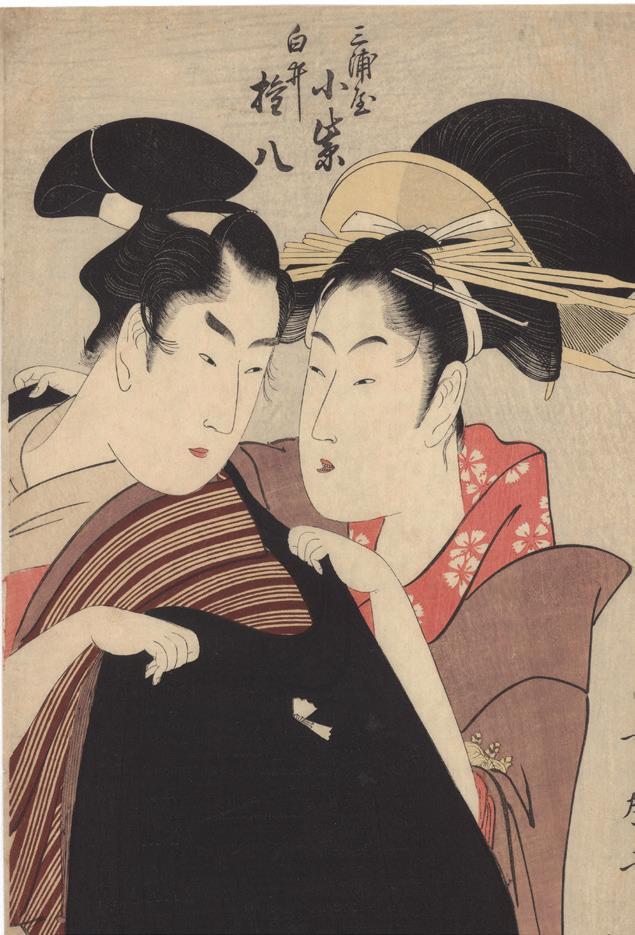 Top left Figure 3: Kitagawa Utamaro (1793–1806), Komurasaki of the Miuraya and Shirai Gonpachi (Miuraya Komurasaki Shirai Gonpachi), from the series True Feelings Compared: The Founts of Love (Jitsu kurabe iro no minakami), ca. 1793–94. Woodblock print; Princeton University Art Museum, Gift of the P. Y. and Kinmay W. Tang Center for East Asian Art, Twentieth Anniversary