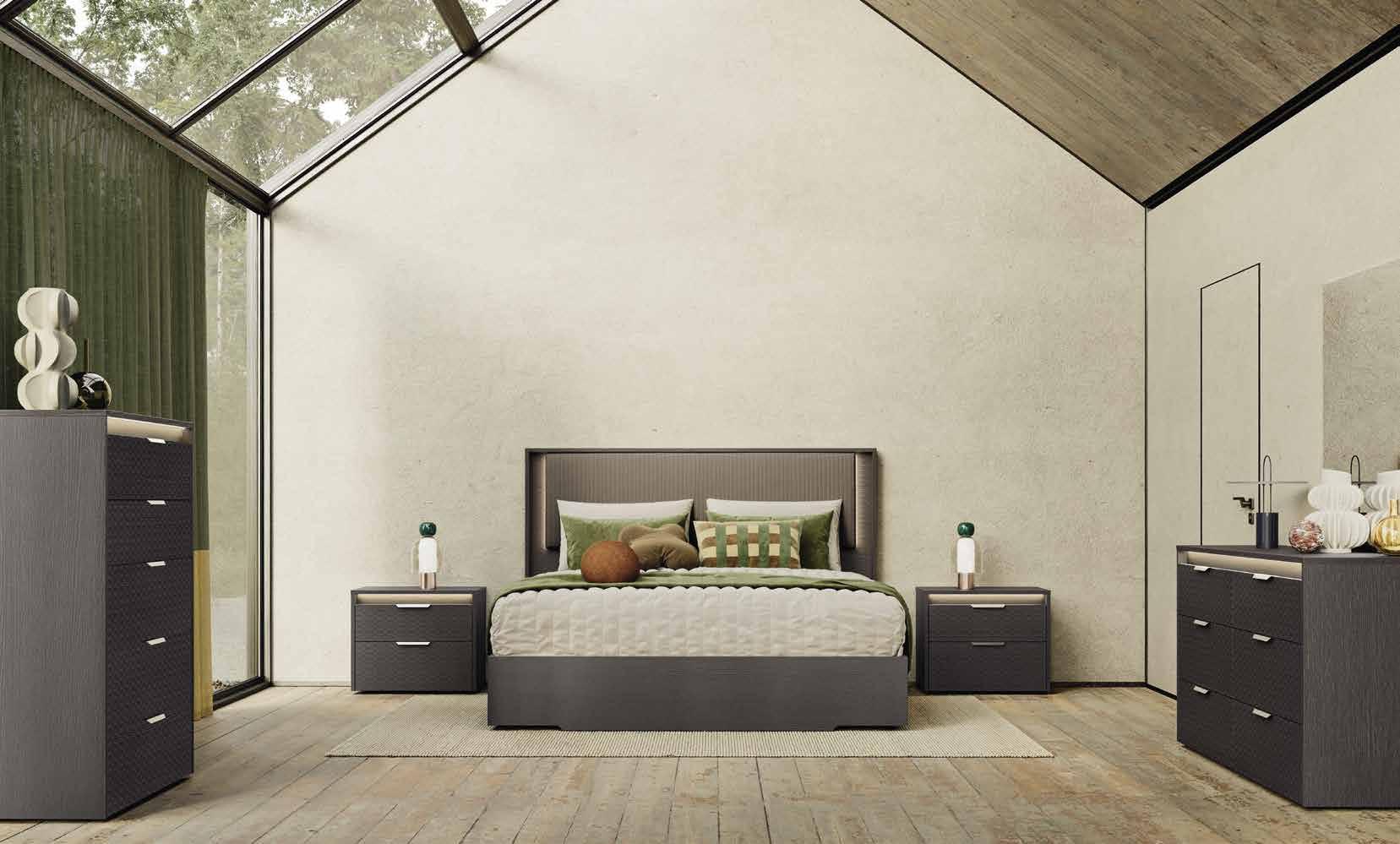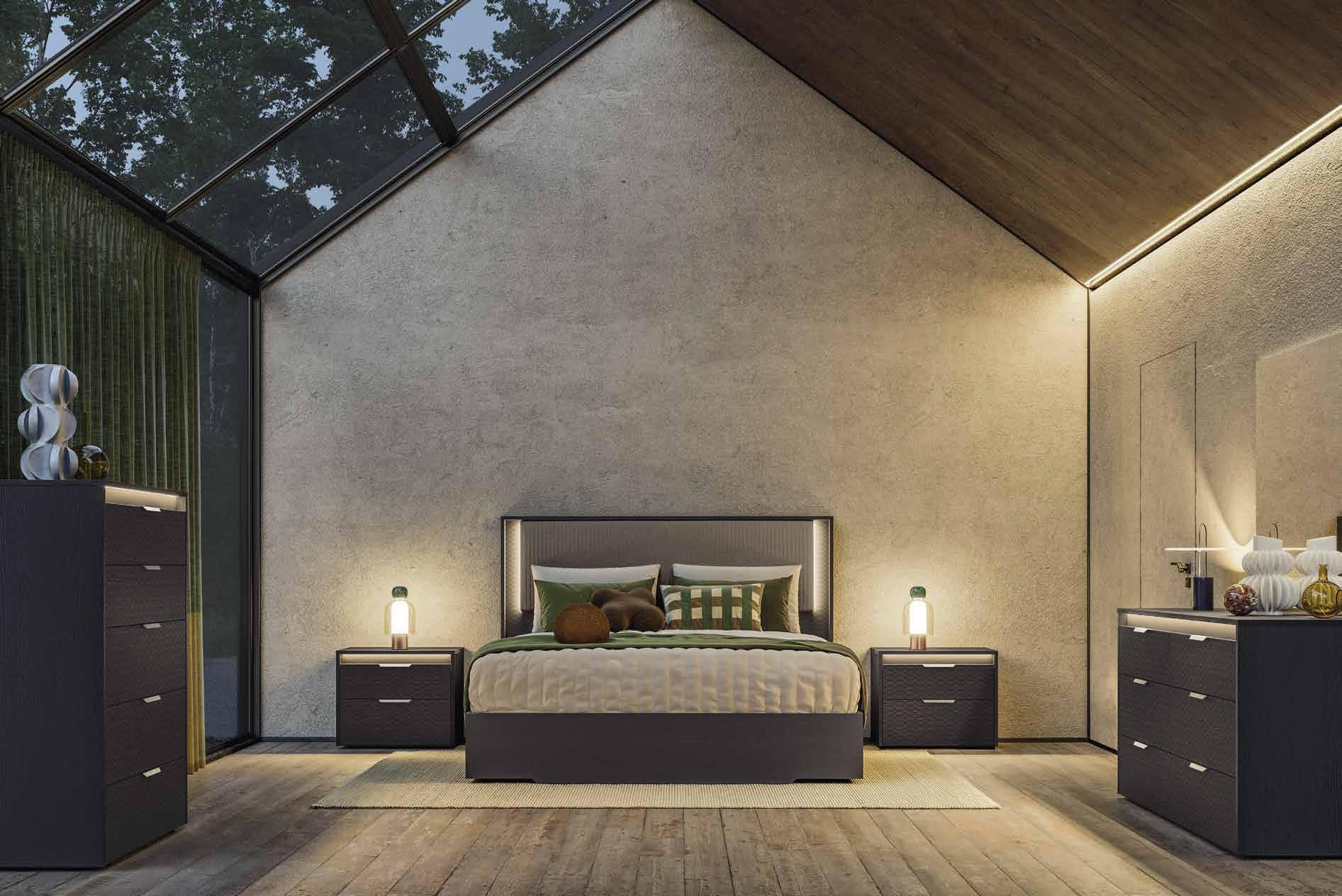 The Amy bed features an eco-leather headboard with integrated lighting and two storage drawers in the platform, offering style and practicality. The nightstands, with Tetris-textured drawer fronts and top-edge lighting, complete the look, adding modern elegance to any bedroom.