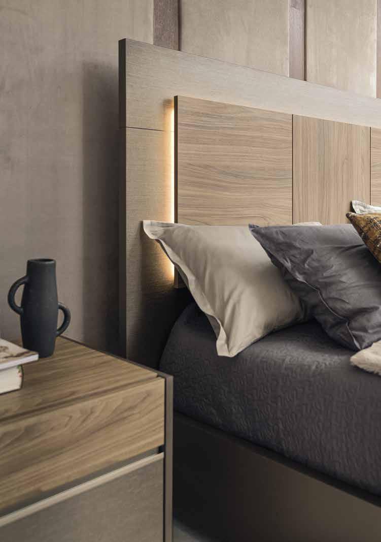 La particolare lavorazione del pannello testiera gioca con luci ed ombre