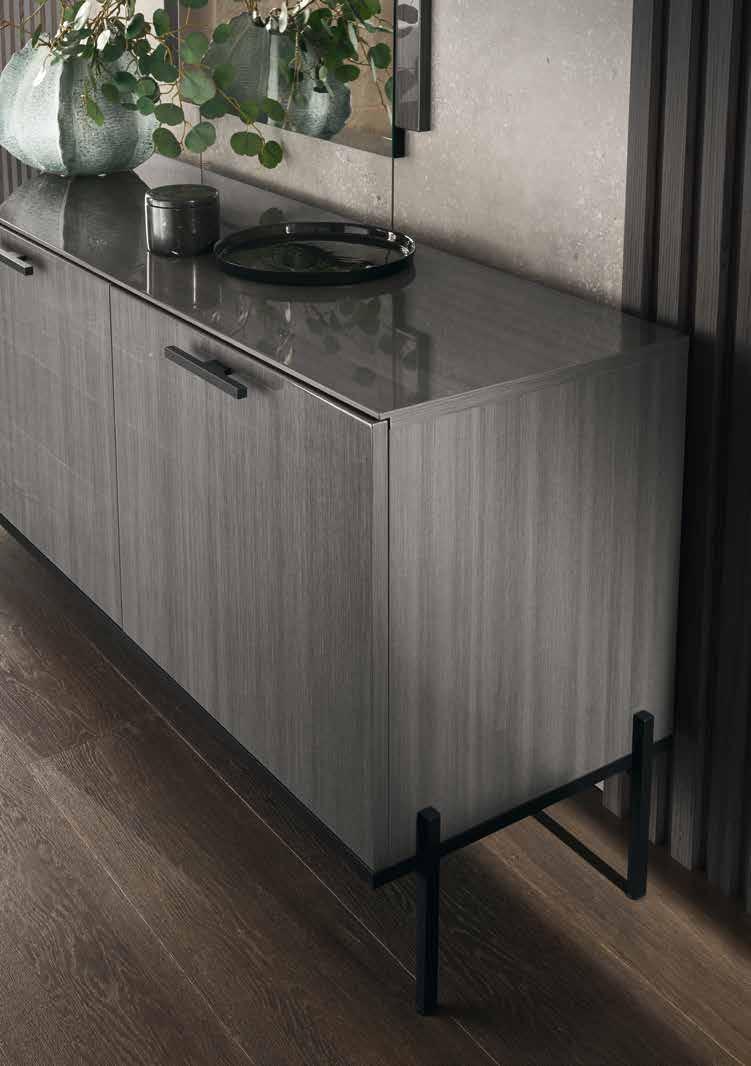Anche la base TV riprende il design della collezione con elementi in metallo finitura nero