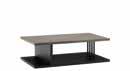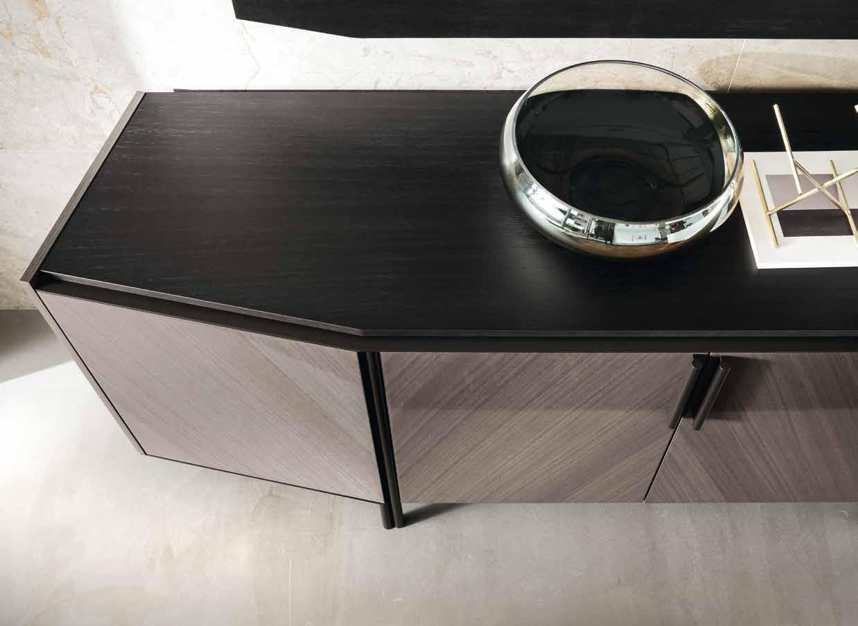 Anche nella base tv le ante legno dall’impiallacciatura inclinata sono incorniciate da elementi verticali e orizzontali in metallo