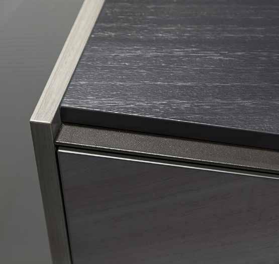 Die Metallrinne, die entlang der gesamten Breite des Möbels verläuft, zeichnet das besondere abgewinkelte Profil nach