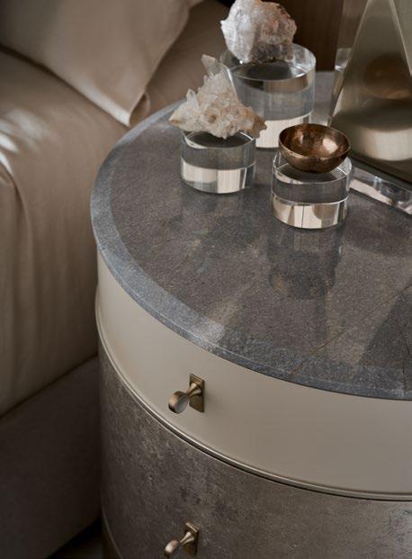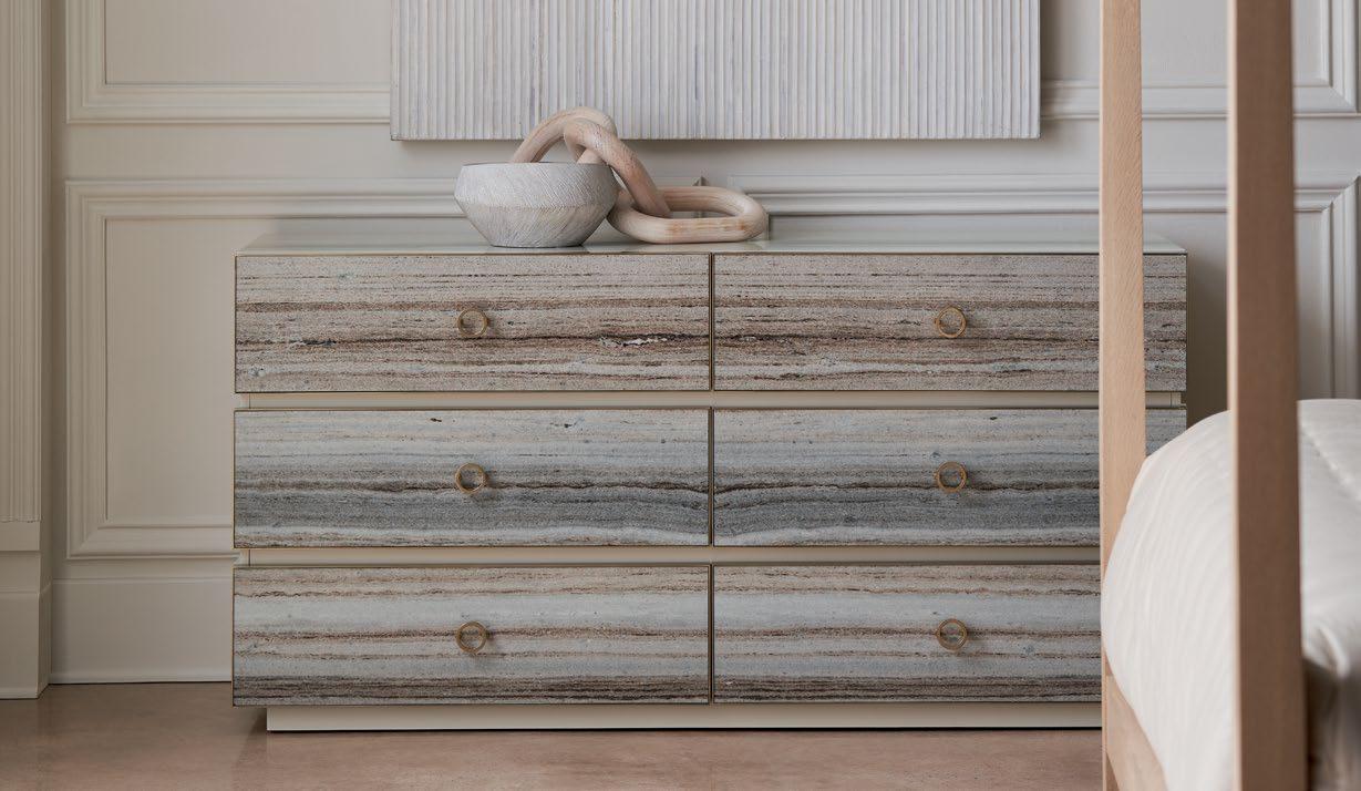 Architectural designs are beautifully balanced by a soothing ecru-colored fabric and soft-to-touch, vinyl-wrapped drawer fronts. A mix of creamy travertine stone, Silver Platano veneers and Lucent Bronze metal adds warmth and subtle contrast to calming, clean-lined forms.