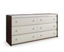 FEATURES Reeded end panels finished in Matte Pearl. Top and drawer fronts covered in vinyl. Six drawers with soft close undermount guides. Interior finish paint to match. Acrylic legs with metal ferrules in Whisper of Gold.