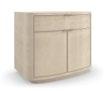 FEATURES Calcutta Oro marble top. Case top, sides and drawer fronts finished in Almond Milk. Wood trim in Toasted Pecan. Two drawers with soft close undermount guides. Drawer interior in Almond Milk.