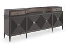 A rich Mocha finish calls attention to radiating starburst patterns on the Daybreak credenza (above) and Prism dresser (at right), for a variation in tone and pattern that complements finishes in a similar hue.