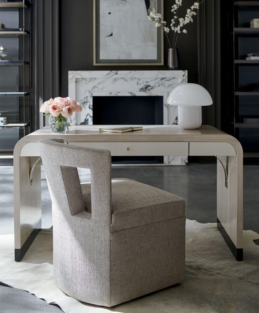 Evoking a sense of metropolitan modernity, visually defined lines intersect with fluid shapes and free-flowing patterns, punctuated by the natural beauty of stone, brushed tungsten and gold metals. A celebration of finery and form: layers of tonal velvets, tactile fabrics, and a buttery soft nubuck leather add luxe notes, elevating function and redefining the way we live, create, and work.