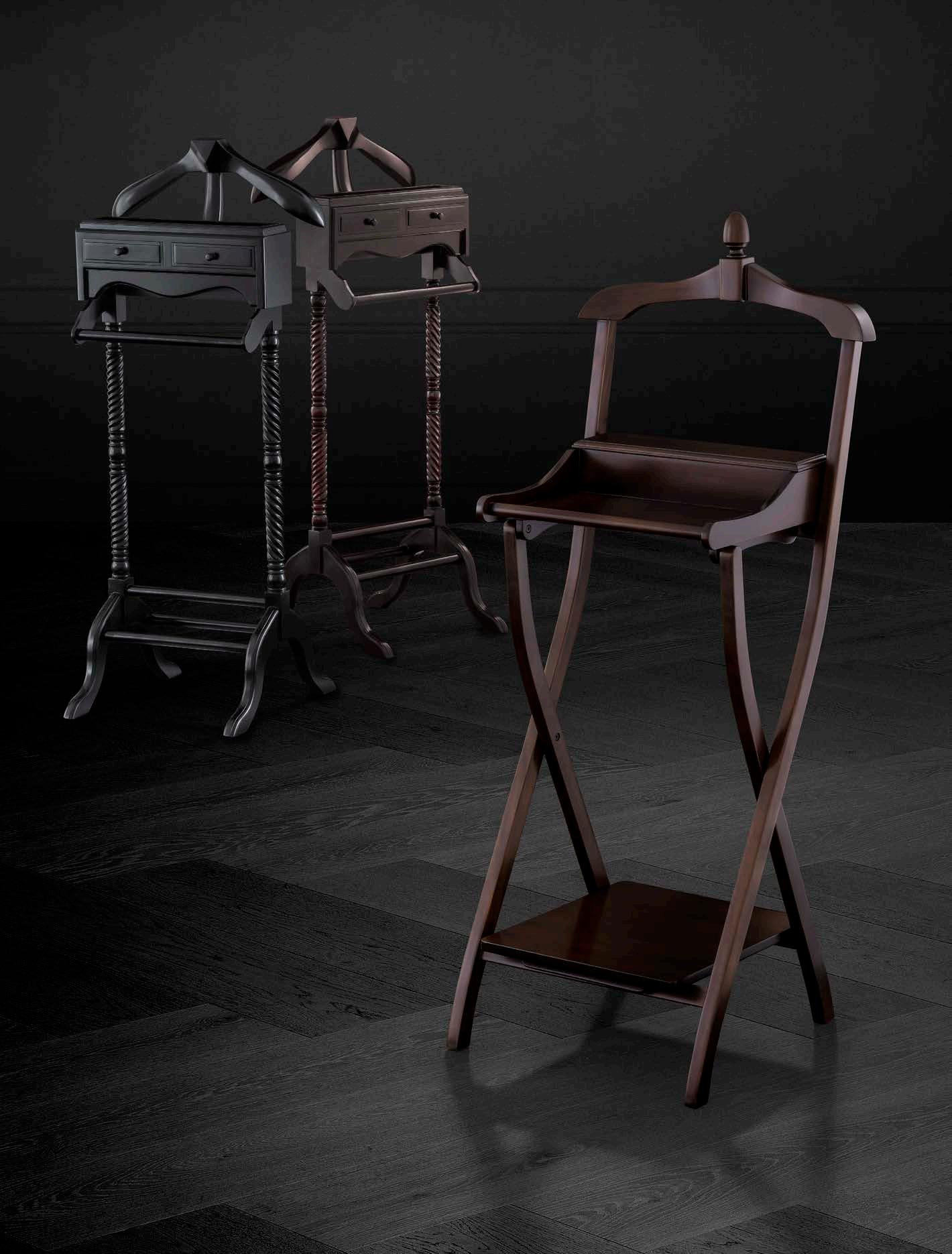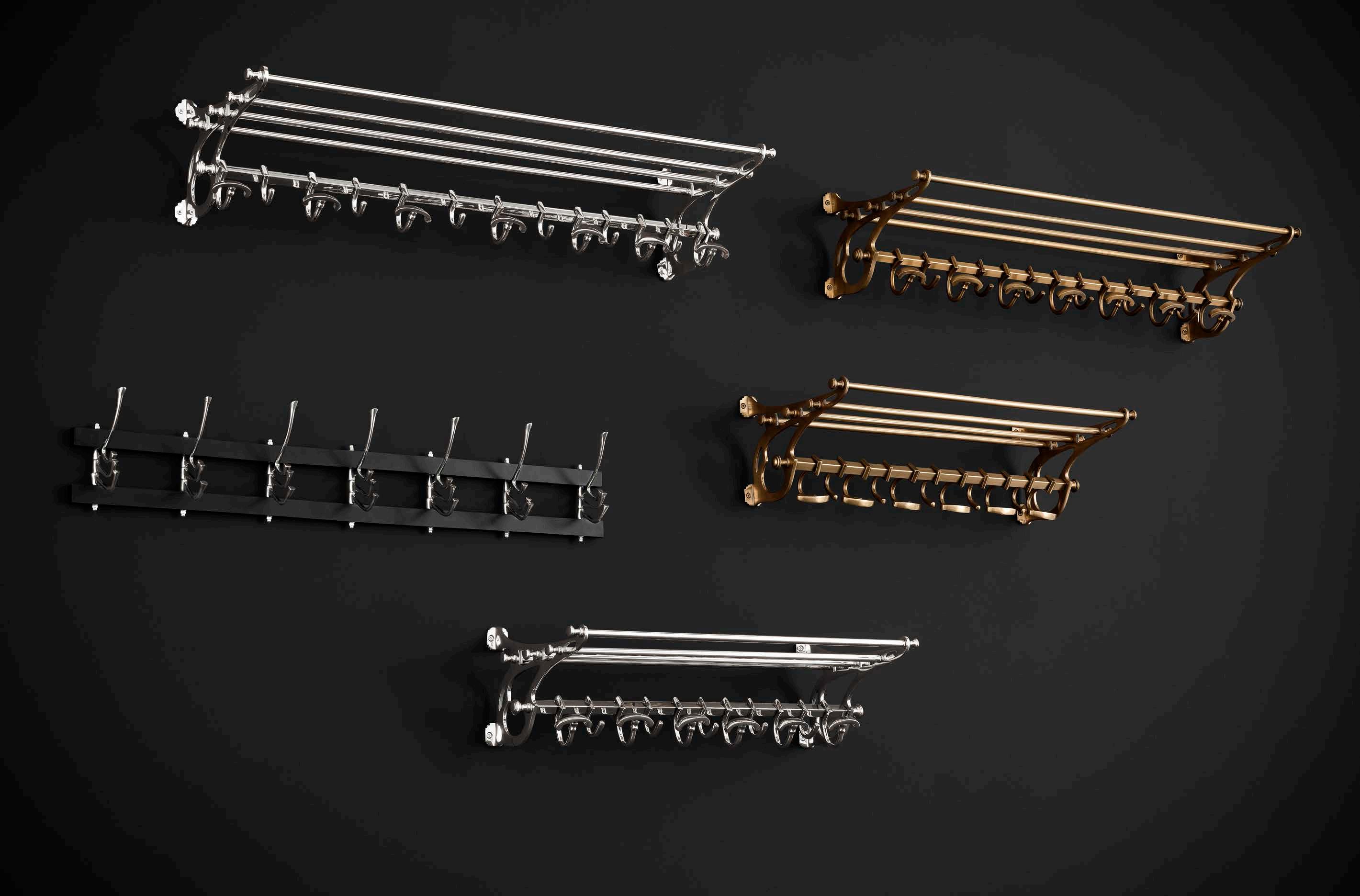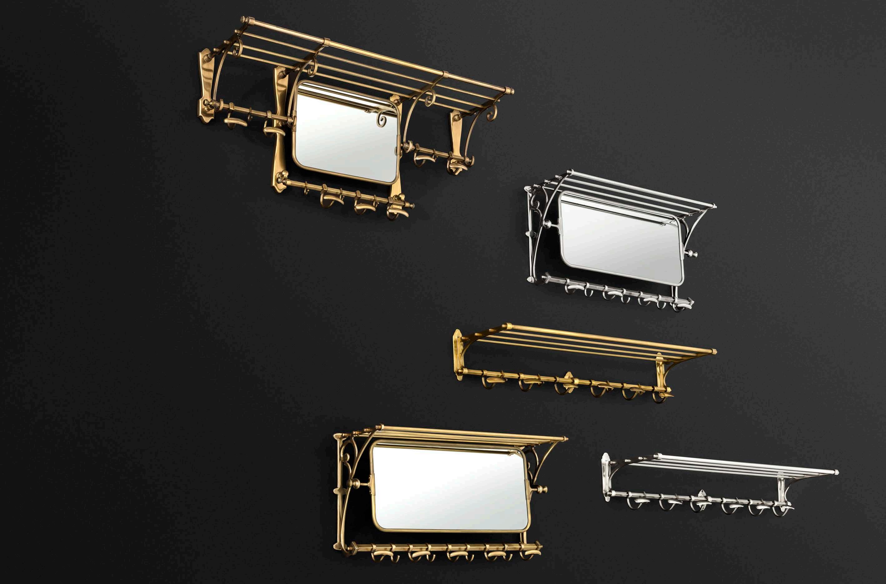 These wall-mounted coat racks are reminiscent of luggage racks in old steam trains. Besides hooks for hanging overcoats and jackets, they all have a top shelf for gloves, hats and the like. In addition, Old French and Varadero feature an adjustable mirror.