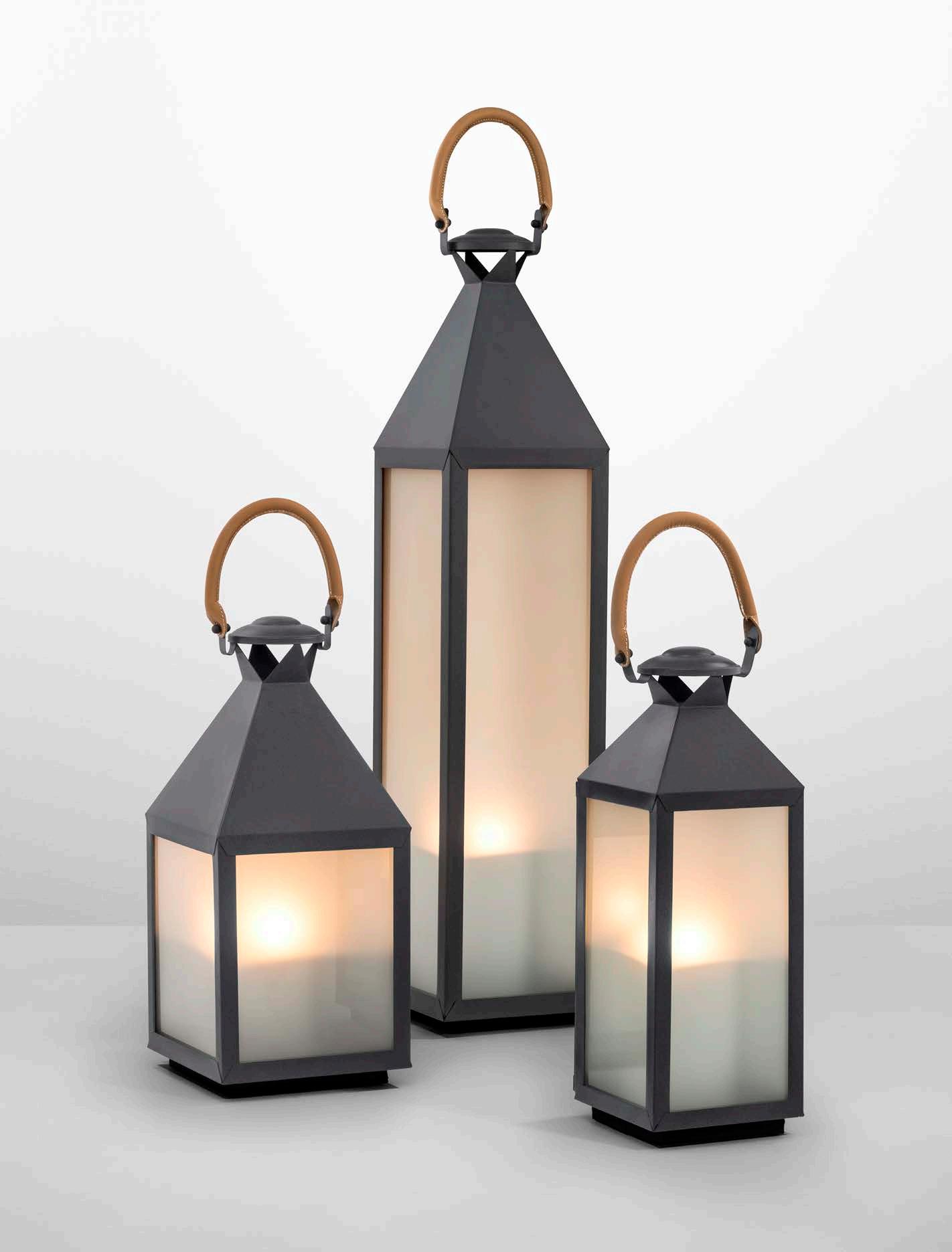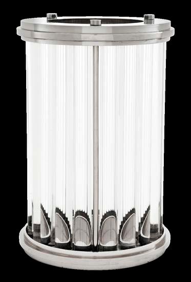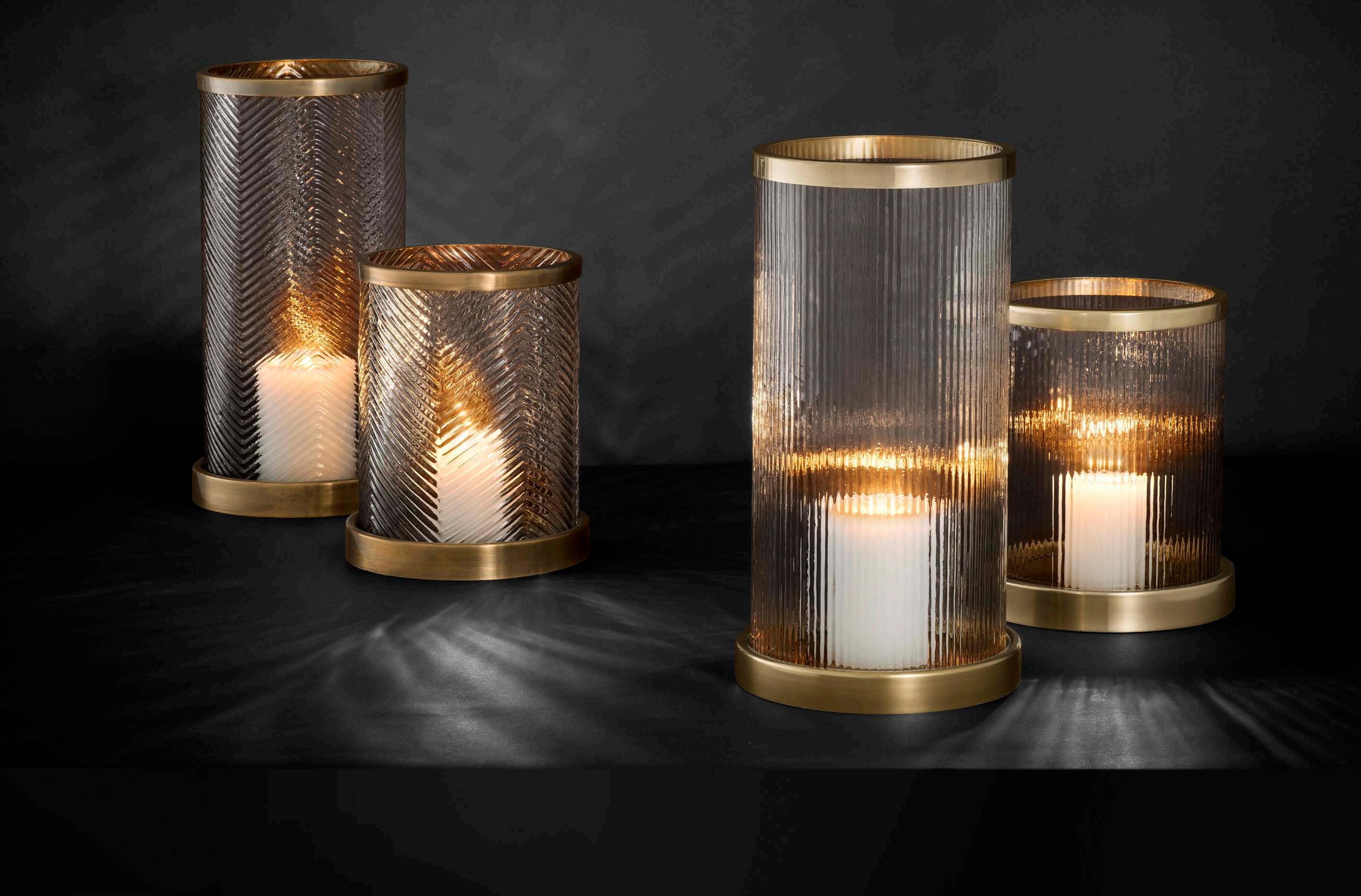 Create a warm subtle glow that awakens the senses with the Ruhlmann Hurricane. This modern interpretation of a classic hurricane lantern is characterised by an exterior of clear glass rods. It features a frame with bronze or nickel finish and offers space to a small pillar candle (not included).
