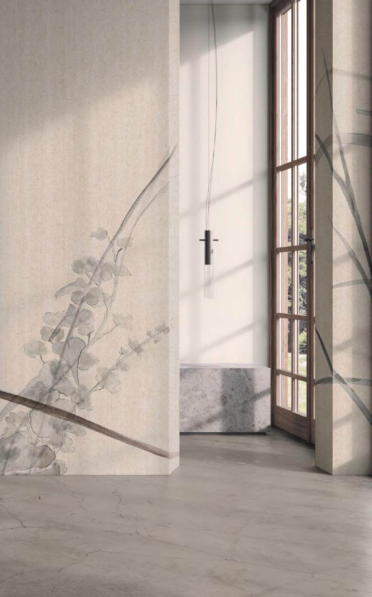 Ispirata alla tecnica giapponese del washi, la collezione gioca sulla stratificazione di elementi naturali o leggere trame trattate come garze impalpabili sovrapposte. Le pareti disegnano spazi dove è presente la natura in una gamma di colori delicati con toni terrosi. Effetti di luci e di ombre, proiezioni e trasparenze di foglie e fiori fluttuano sospesi sulla superficie, proponendo un approccio olistico all’abitare che segue i principi della biofilia e invita alla riconnessione con il mondo naturale.
