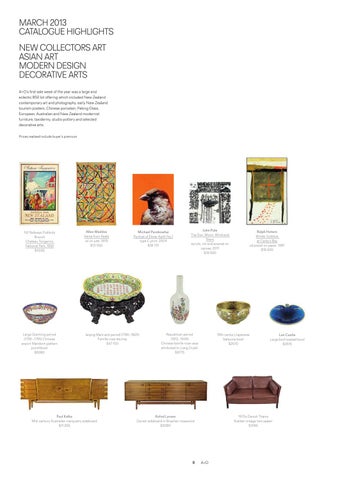 MArcH 2013 cAtALoGuE HiGHLiGHtS nEw coLLEctorS Art ASiAn Art MoDErn DESiGn DEcorAtiVE ArtS A+o’s first sale week of the year was a large and eclectic 850 lot offering which included new Zealand contemporary art and photography, early new Zealand tourism posters, chinese porcelain, Peking Glass, European, Australian and new Zealand modernist furniture, taxidermy, studio pottery and selected decorative arts. Prices realised include buyer’s premium