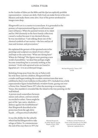LINDA TYLER in the Garden of Eden yet the Bible and the Qur’an explicitly prohibit representation – statues are idols. Only God can make forms in his own likeness and make them come alive. Fear of the power attributed to images runs deep. Illingworth’s art is a counter to iconoclasm. It is grounded in the potency of representational figures to tell stories and exert influence. When his painted version of As Adam and Eve 1965 (formerly in the Paris Family collection) caused a ruckus because it was deemed obscene, he was incredulous: “I am talking about one of the classical symbols of our society – the love and joy of man and woman, and procreation.” He explained the gesture of the upraised arm in his paintings and sculpture as a kind of wave of fear and hope at the same time: “What am I doing here? Where do I belong?” His figures were greeting a new world of possibility: “an ideal that perhaps might become something but is certainly nothing at the moment.” Gods with upraised arms are found in Egyptian art – it is an archetypal image.