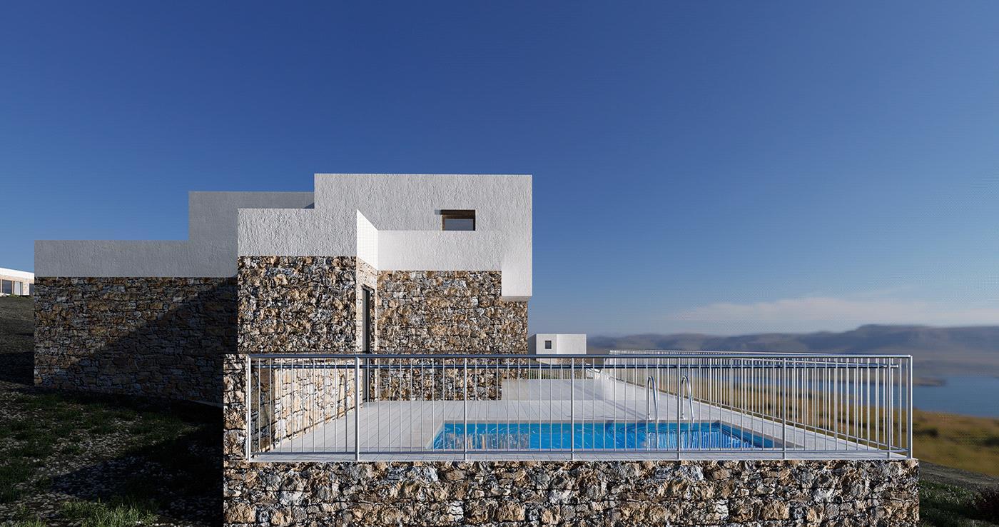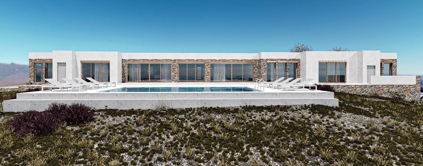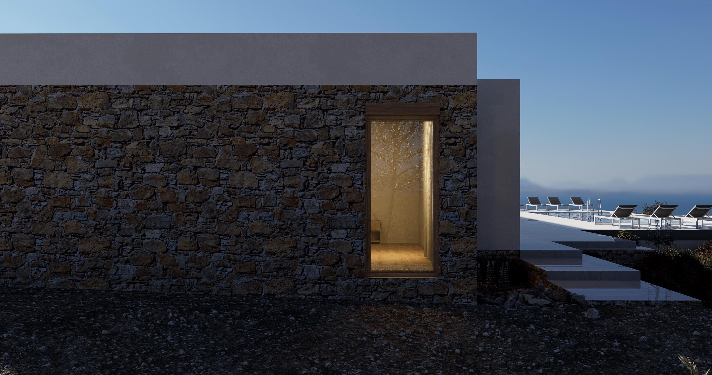 Project Design Villa in Antiparos, Greece for the second time for the same client. This project includes four residential buildings, with the main one containing four bedrooms, a large living space, a dining table, a wine cellar, and a library/working area. An infinity pool with a seascape view is located in front of these buildings. The main material used is local stone, which is in accordance with cultural heritage and provides a strong link to Greek traditional architecture.