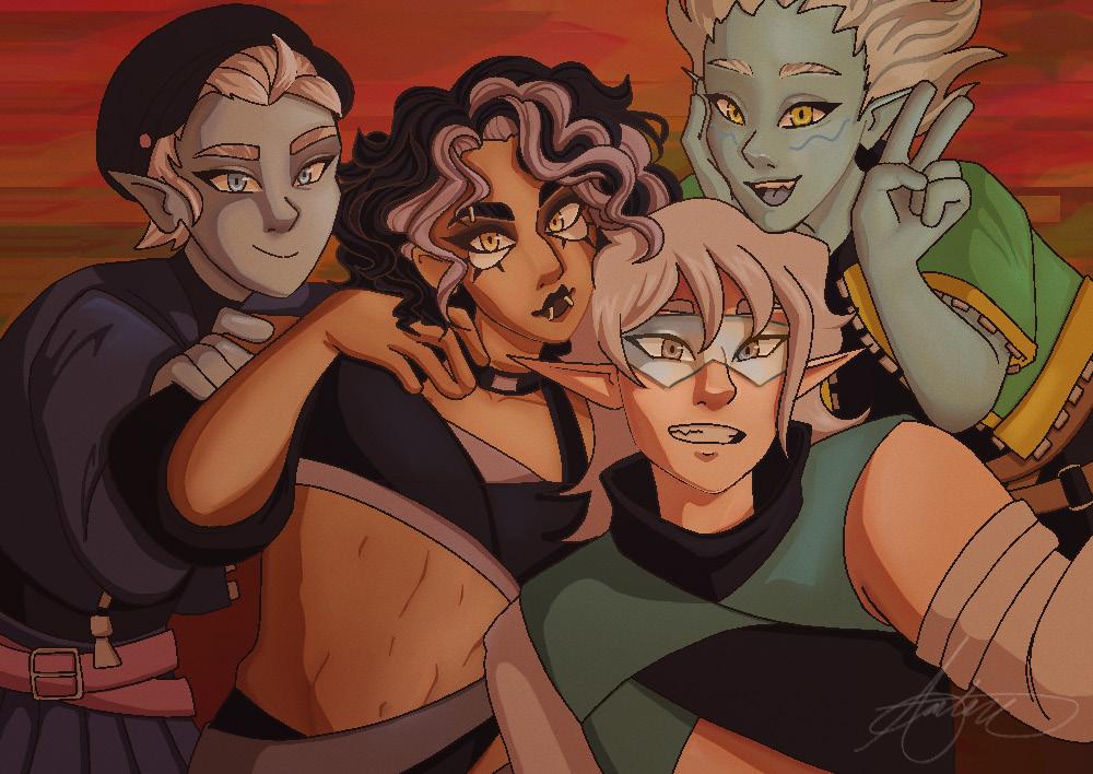 This illustration is a personal project completed using digital tools. The Twilight Trio is a group of friends from a Dungeons and Dragons campaign. Despite all of their conflicts and struggles, they continue to prevail and remain friends.