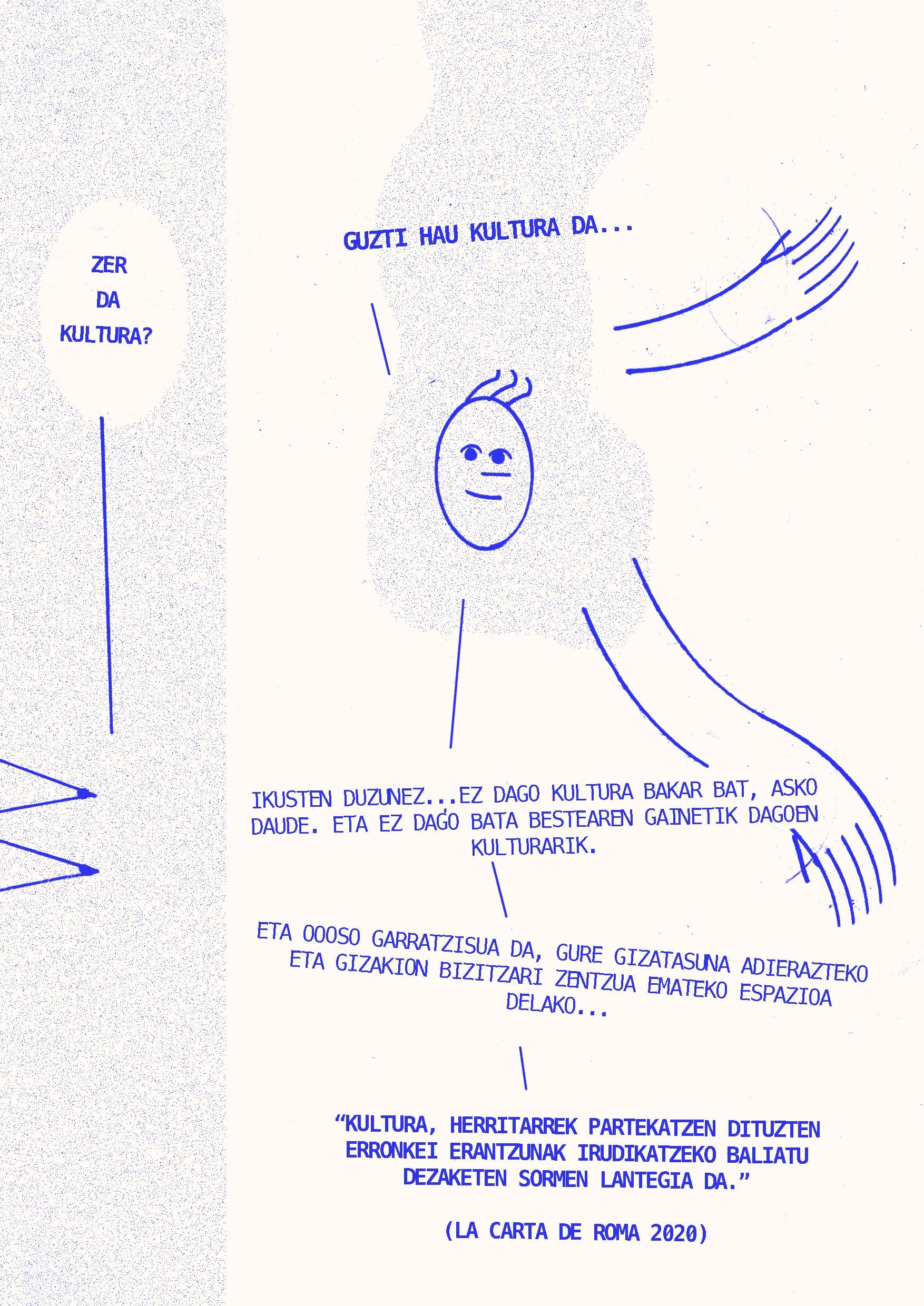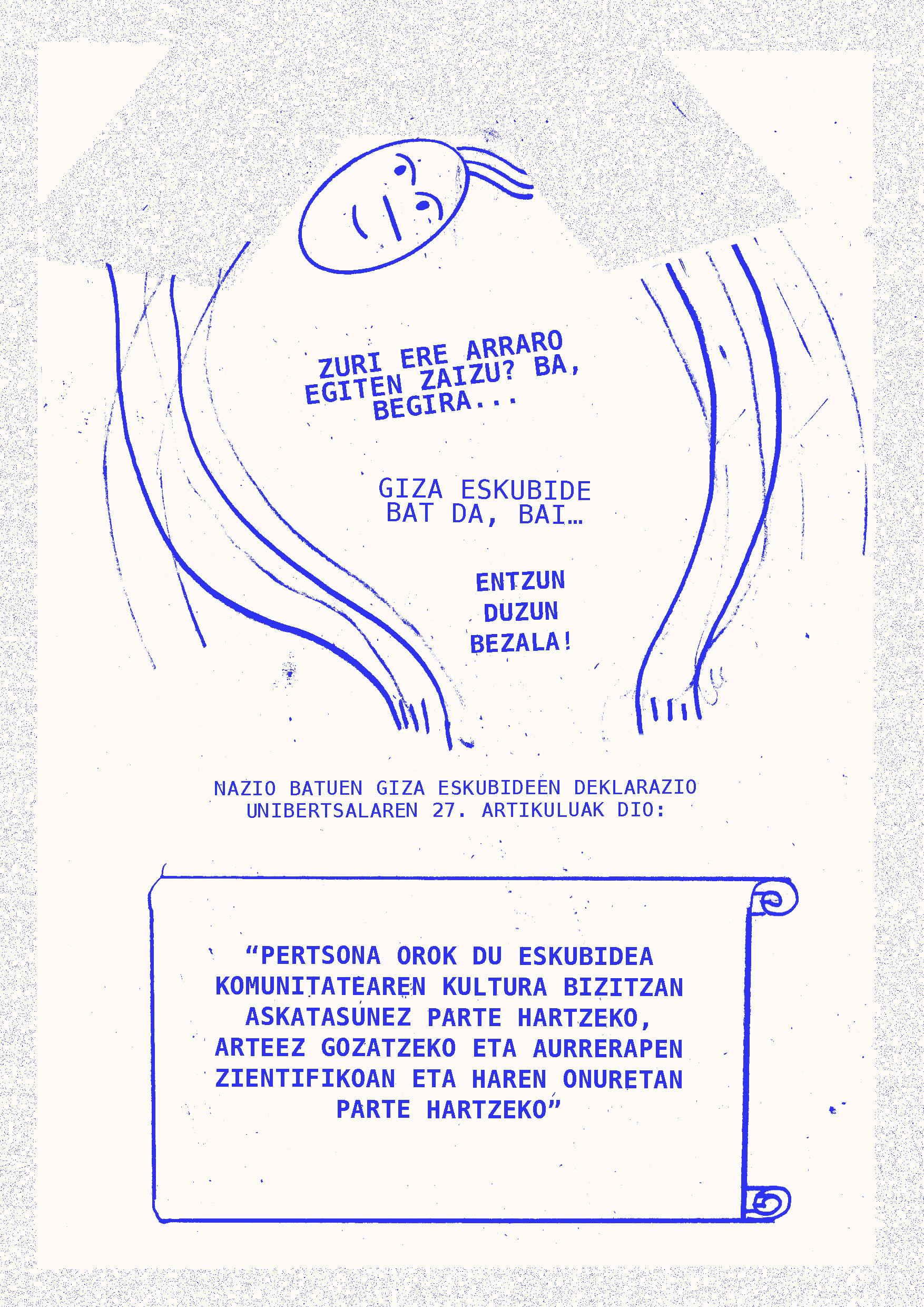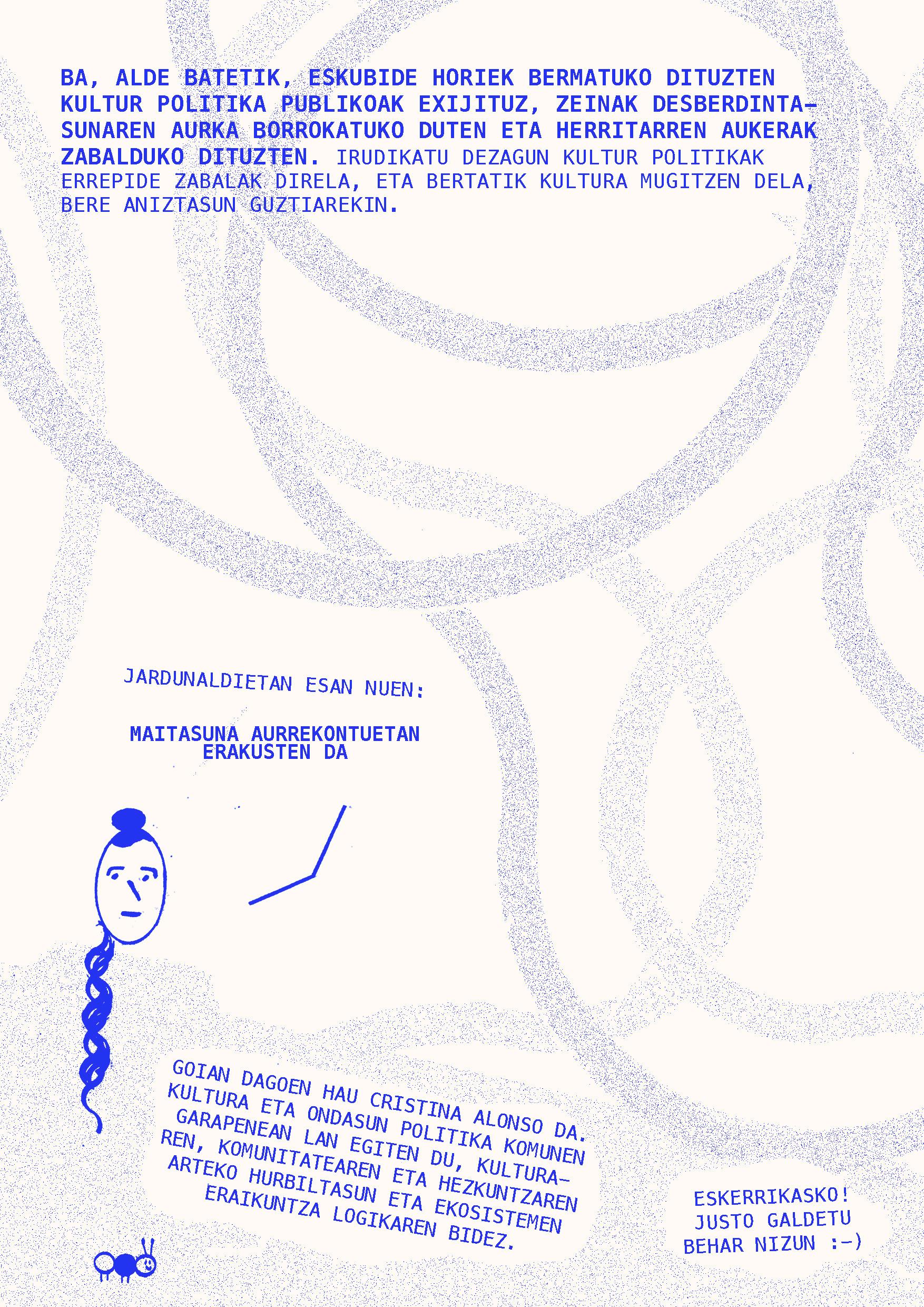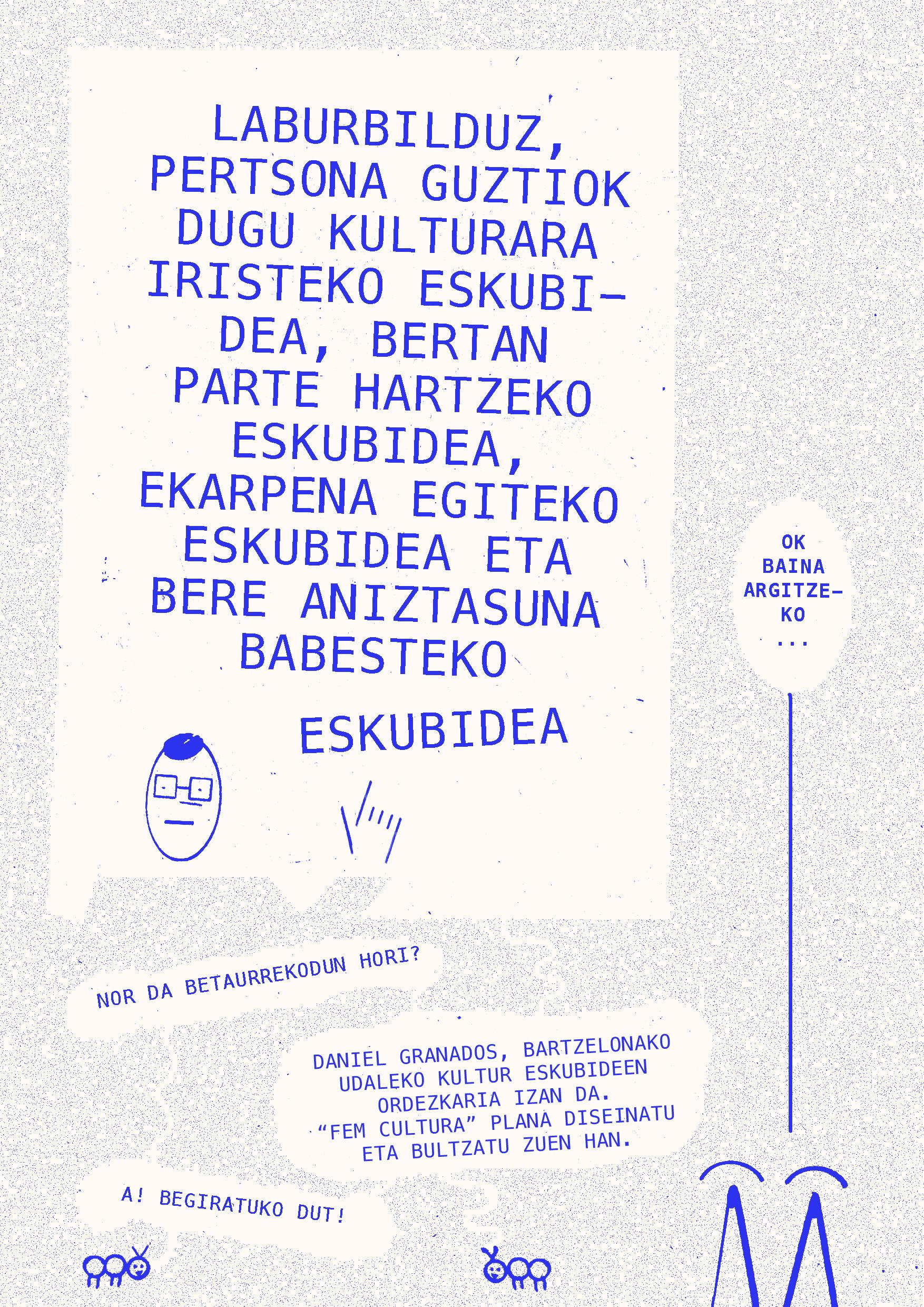2024ko martxoaren 20an Intxaurrondo Kultur Etxean antolatuta genuen Eskubide kulturalak. Begirada aldaketa jardunaldian landutako edukiarekin osatu da fanzinea. Nola egin kultura guztiontzako irisgarriagoa izan dadin? galderaren inguruan hausnartzen ibili ginen Daniel Granados, Cristina Alonso eta Iker Atxa hizlariekin zein parte hartu zuten bestelako ahotsekin batera.