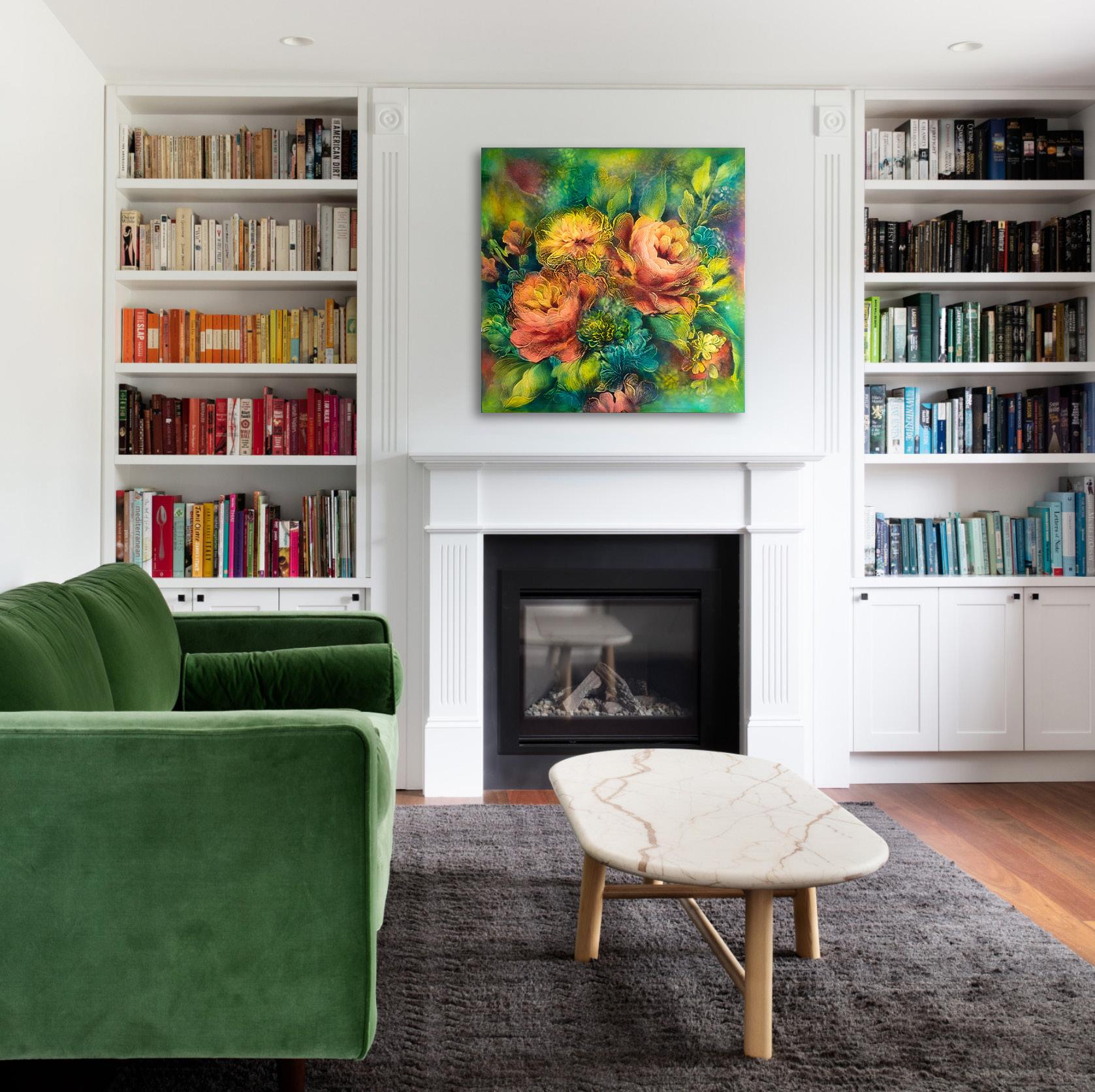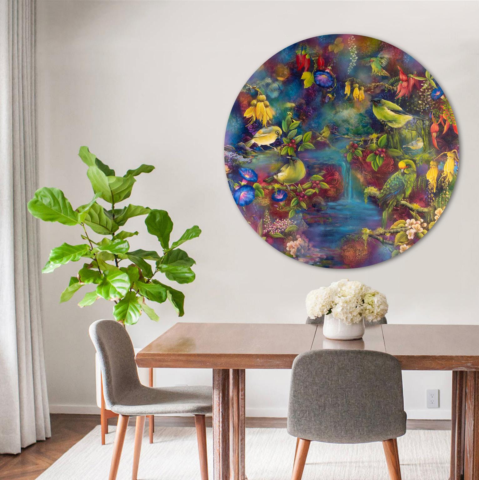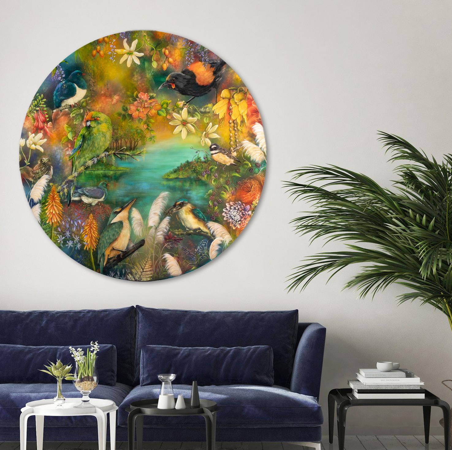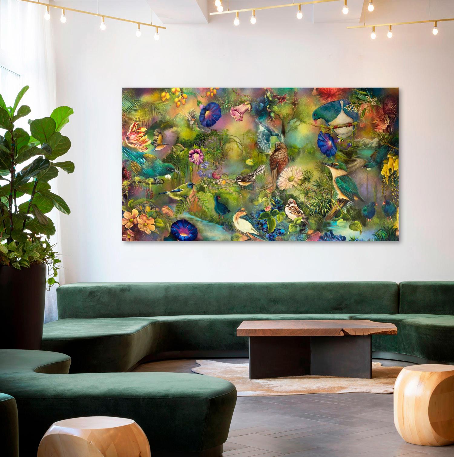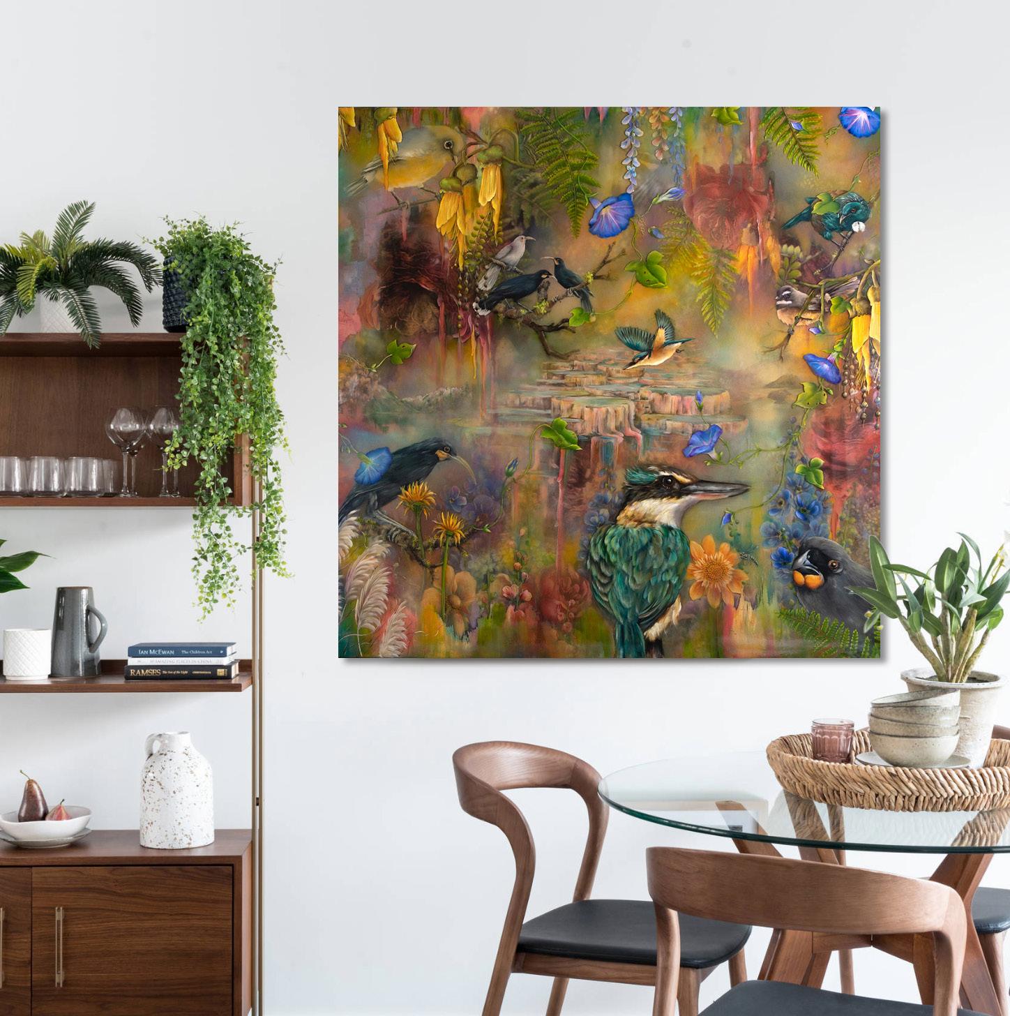 Janette CervinJanette Cervin creates large-scale paintings that offer an invitation to an immersive antipodean paradise teeming with exquisitely detailed New Zealand flora and fauna. Vibrant hues bring plumage and petals to the forefront, creating a whimsical dance of detail and colour. An immersive illusion of depth is created through the combination of traditional painting conventions and applications of thick layers of glossy resin.
