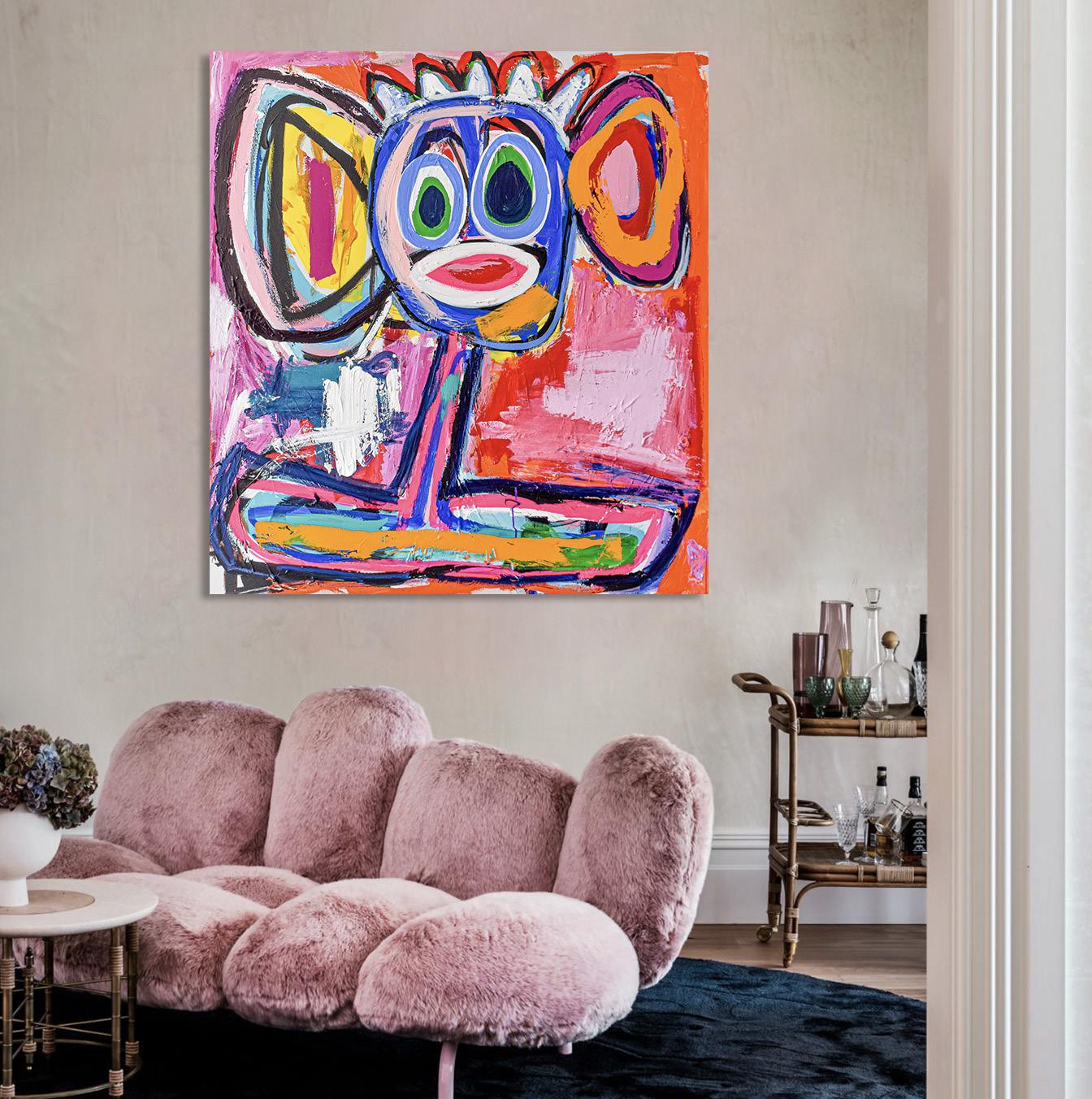 Going back to the inspiration for this exhibition, the works are constructed around large, childlike faces, each one representing a different character. Each character in turn represents a type of person in our world, but in a primitive way. There is a real naivety to the works, and yet at the same time each character draws us into their own story.