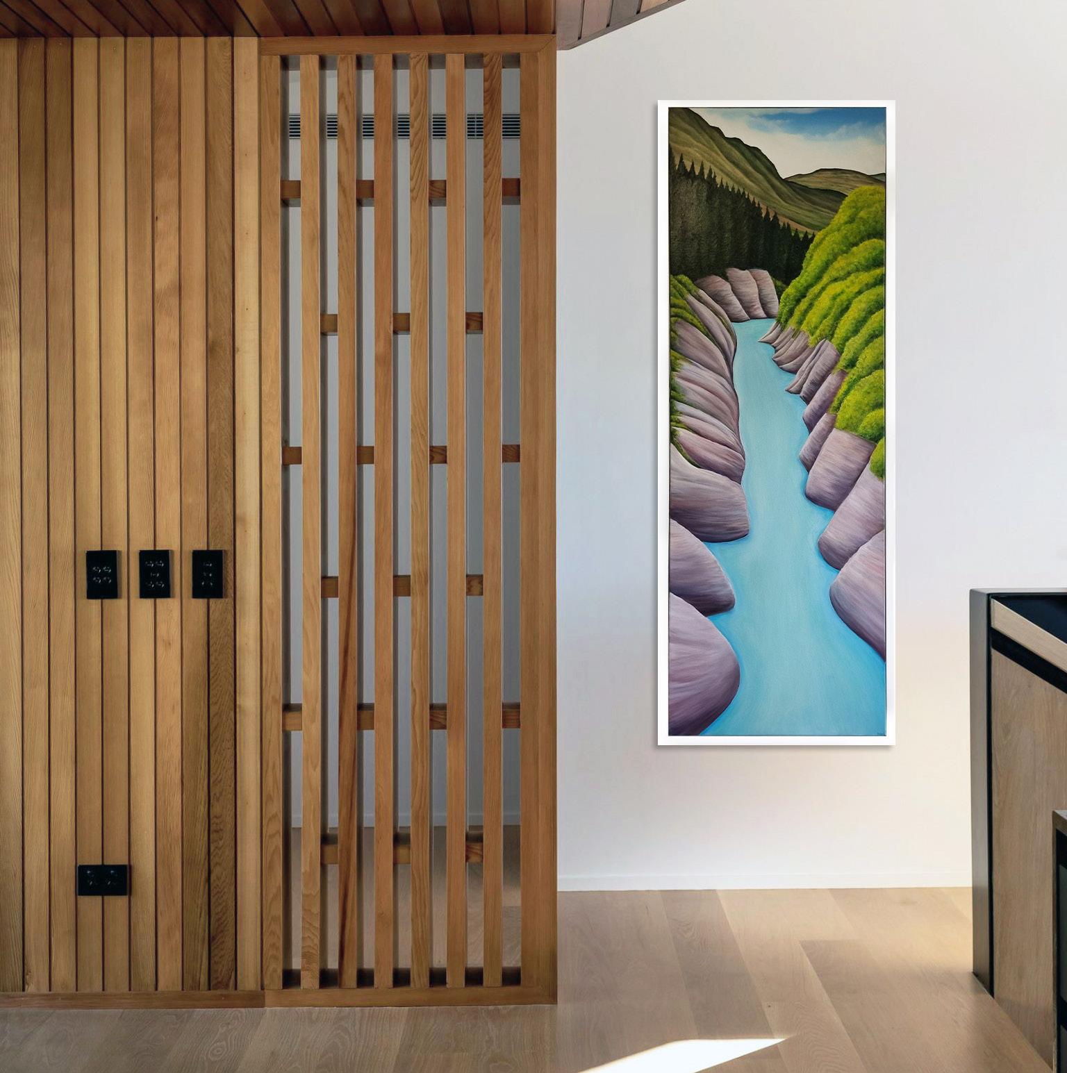 “In my latest exhibition at Artbay Gallery in Queenstown, I have brought together a group of six new paintings that celebrate some of my favourite places. Two of these new works are based on our beloved Pohutukawa in full bloom which l am surrounded by where l live and just can’t stop looking at. I take great joy in the use of the varying shades of red which I’ve continued to explore over these last two years.”