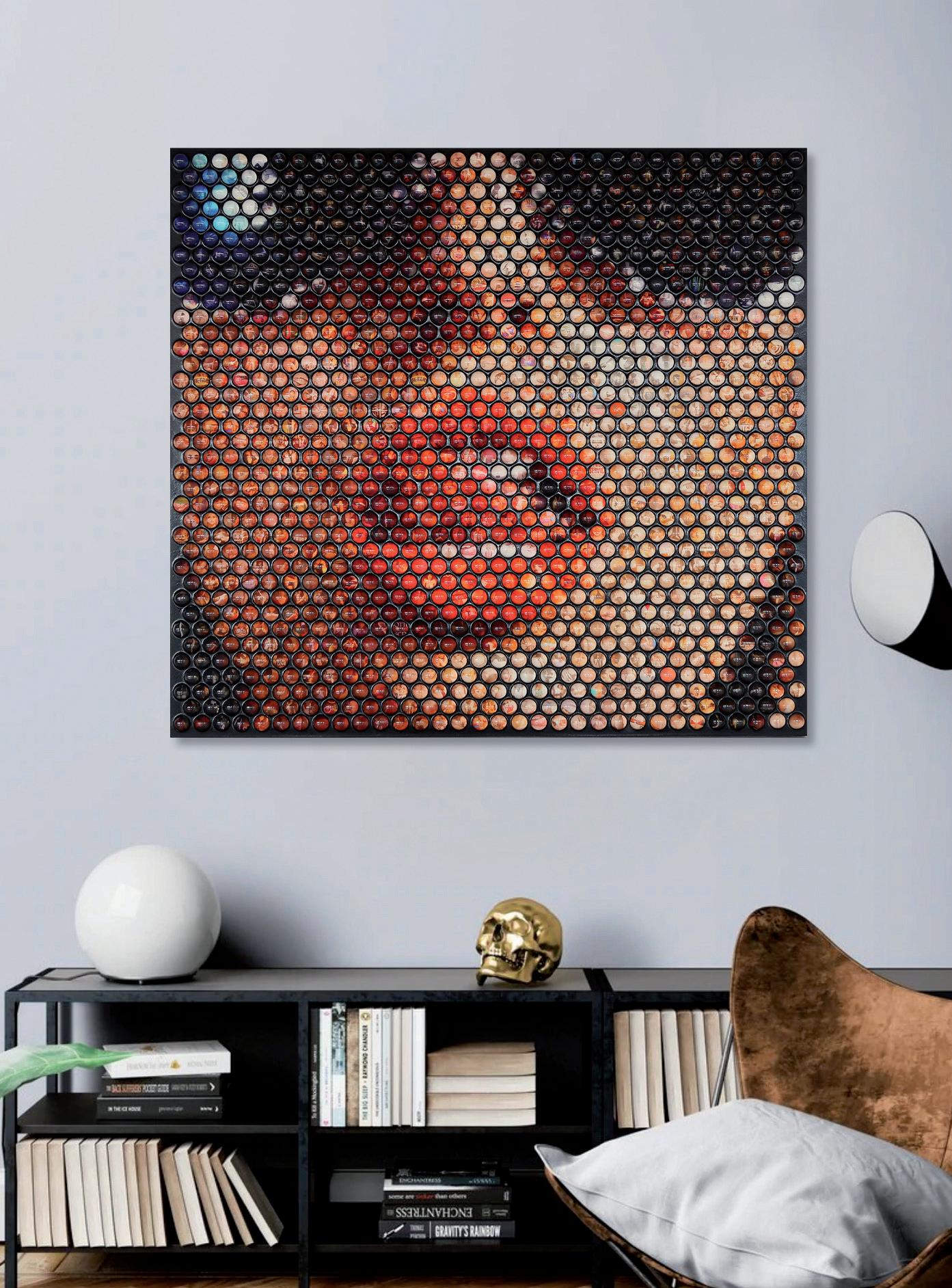 After collecting thousands of images from iconic movies, and vintage comic strips, Jantzen organizes them by theme and colour and embeds them in small handmade resin spheres. He aligns dozens of the spheres together to create large-scale mixed media photographic portraits. The work requires and inspires viewers to constantly investigate their perspective through the interplay of walking up close and standing at a distance.