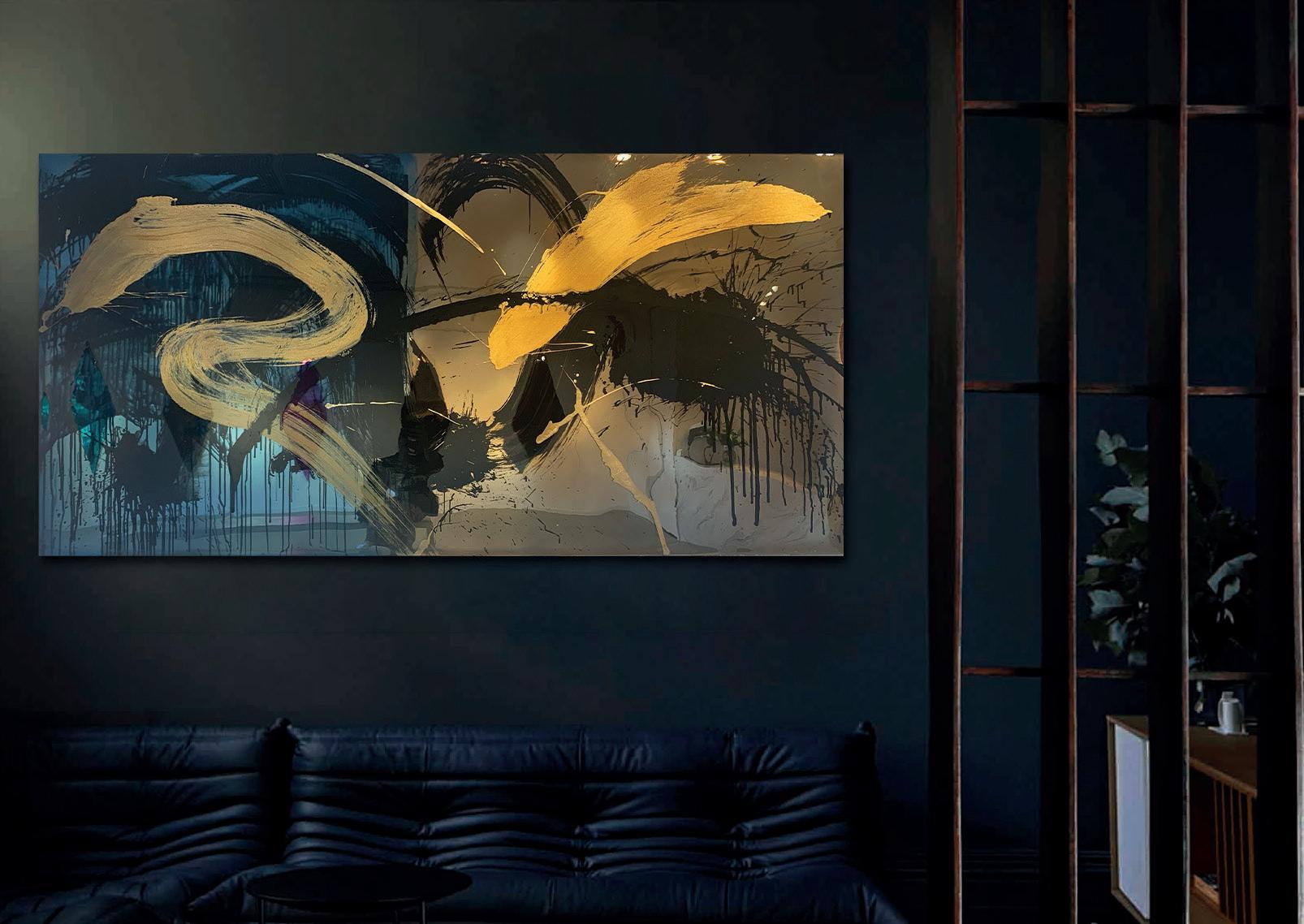 Vibrant colours are mixed with sombre hues and rich golds, channelled onto the canvas with physical movements, sweeping marks, dripping flicks and elaborate pours. Each layer of the painting is thoughtfully superimposed over time, resulting in an intricate, pristine, and unified composition.