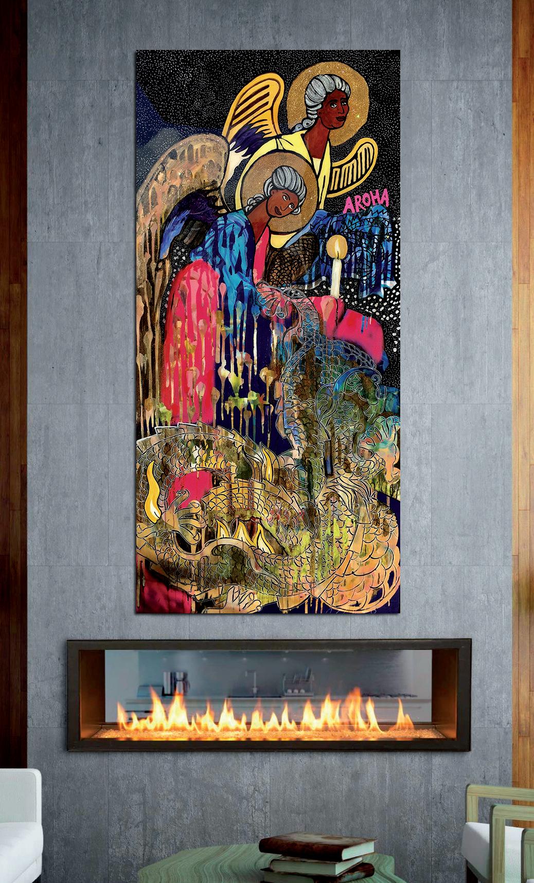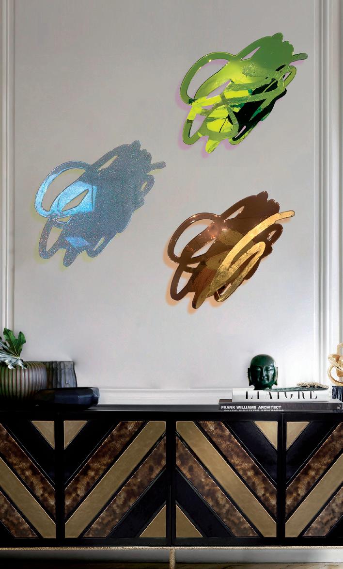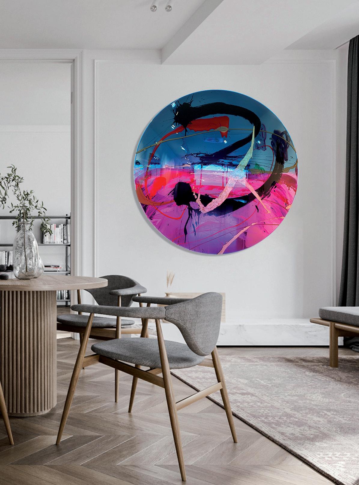Using a mirror as a canvas, unique luminous light and depth is captured in her paintings and in addition, the reflection of the viewer’s own gaze and their surroundings. The veneers of poured glass preserve each layer of the painting as the overlapping images are embedded within each transparent glass pour. The edges of the painting are hand-gilded and project an aura of light onto the wall.
